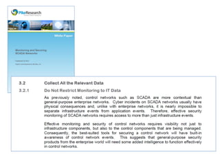 This document summarizes a presentation on cyber security in real-time systems. It discusses threats to industrial control systems and SCADA systems, and the differences between traditional IT and industrial control system cultures. It provides examples of attacks on industrial control systems and poor monitoring of SCADA systems. It suggests that security operations centers may provide common ground between IT and ICS. Finally, it discusses recent media reports relating to hacking of rail signaling systems and aircraft systems.