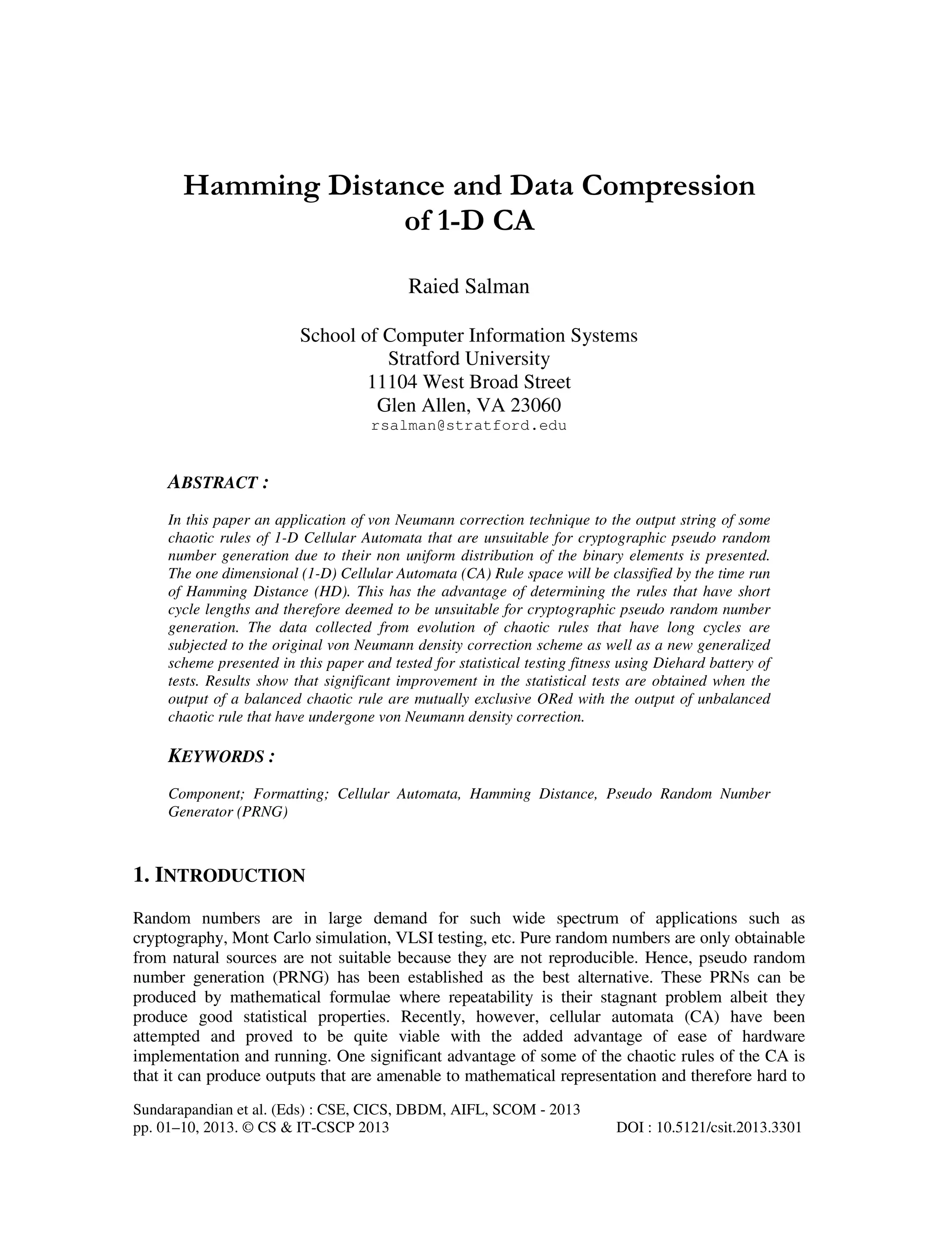 This document summarizes an analysis of using Hamming distance to classify one-dimensional cellular automata rules and improve the statistical properties of certain rules for use in pseudo-random number generation. The analysis showed that Hamming distance can effectively distinguish between Wolfram's categories of rules and identify chaotic rules suitable for cryptographic applications. Applying von Neumann density correction and combining the output of two rules was found to significantly improve statistical test results, with one combination passing all Diehard tests.