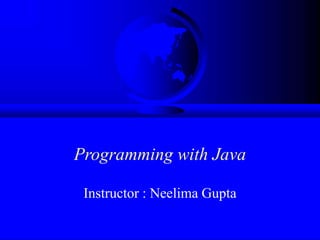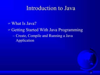 This document provides an overview of Java programming concepts. It introduces Java, discusses its key characteristics like being object-oriented and portable, and covers basic Java concepts such as variables, data types, operators, and methods. It also demonstrates how to compile and run a simple Java application and includes examples of code snippets.