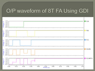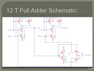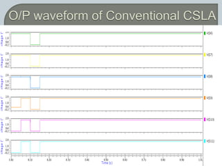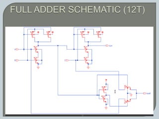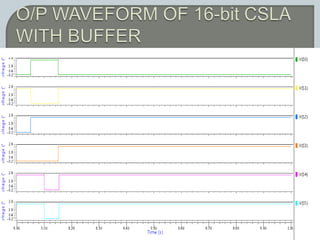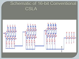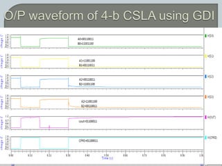 The document discusses the Carry Select Adder (CSLA), highlighting its architecture with dual Ripple Carry Adders (RCA) and multiplexers for efficient arithmetic operations. It details the implementation of low power digital designs using Gate Diffusion Input (GDI) techniques, showing comparisons in transistor count, delay, and power consumption between conventional CSLA and GDI designs. Additionally, it references various studies and conferences on advancements in low power and high-speed digital circuit designs.