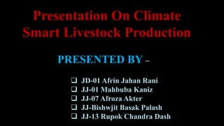 This document presents a summary of a presentation on climate-smart livestock production. It introduces the topic and defines climate-smart livestock production as sustainably increasing productivity while enhancing adaptation, removing greenhouse gases, and achieving food security. It then discusses the contributions of livestock to global food supply, resource use, and GDP. The presentation outlines the greenhouse gas emissions from livestock production and their various sources. It also examines the impacts of climate change on livestock health, reproduction, and infectious diseases. Finally, it proposes several solutions to mitigate livestock's environmental impacts, including agroforestry practices, improved waste management, biotechnologies, and use of plant secondary metabolites in animal feed.