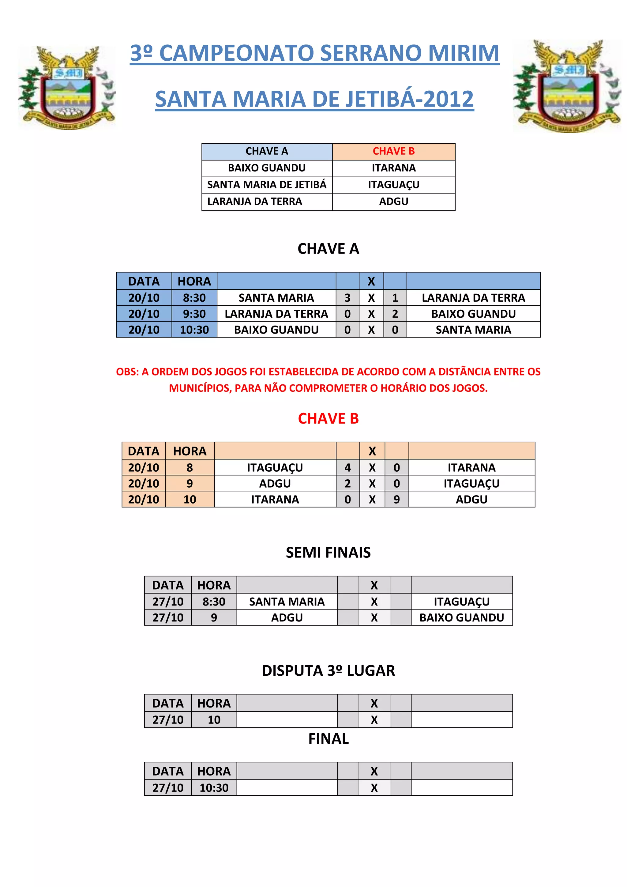 The document summarizes the results of the 3rd Campeonato Serrano Mirim youth soccer tournament held in Santa Maria de Jetibá, Brazil in 2012. It includes the group stage schedules and results for groups A and B, the semi-final matchups, and individual player stats tracking goals and cards for each team. The tournament featured teams from Baixo Guandu, Santa Maria de Jetibá, Laranja da Terra, Itarana, Itaguaçu, and ADGU.