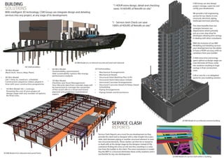 CSM Group is an engineering firm that provides 3D BIM modeling, design, and engineering services. They offer modeling of buildings, industrial plants, mining operations, and infrastructure. Their modeling allows clients to visualize projects, check for design errors or clashes, and extract cost estimates. CSM cites that adding only 1 hour of modeling at the design stage can save 10 hours of costly retrofitting during construction by catching issues early. Clients praise CSM's ability to solve complex problems, deliver innovative solutions, and save both time and money on their projects.