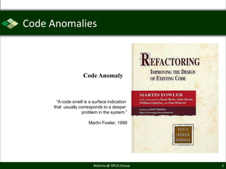 The document analyzes the relationship between code anomalies and architecture degradation in software systems. It studies this relationship across multiple systems and revisions to answer three questions: 1) Are anomalous code elements related to architecture problems? 2) Which characteristics of code anomalies are relevant for architecture? 3) Did refactorings address architecturally-relevant code anomalies? The study collected data on code anomalies, architecture problems, and refactorings. Statistical tests found that code anomalies were related to architecture problems in 77.5% of versions analyzed. Further analysis identified which specific anomalies and characteristics caused architecture problems.