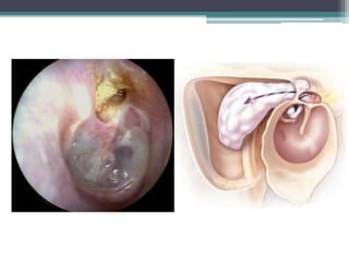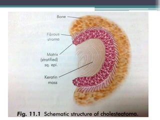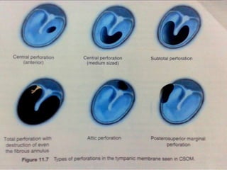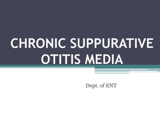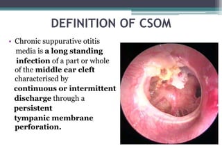 Chronic suppurative otitis media (CSOM) is a long-standing ear infection characterized by persistent ear drainage through a perforated eardrum. It is more common in developing countries and affects all ages. CSOM can be tubotympanic type, confined to the middle ear space, or atticoantral type, involving the mastoid air cells. Atticoantral disease poses greater risks of complications due to bone erosion and possible cholesteatoma formation. Treatment involves topical and oral antibiotics as well as surgical procedures like myringoplasty, tympanoplasty, and ossiculoplasty to repair damaged structures and stop drainage.