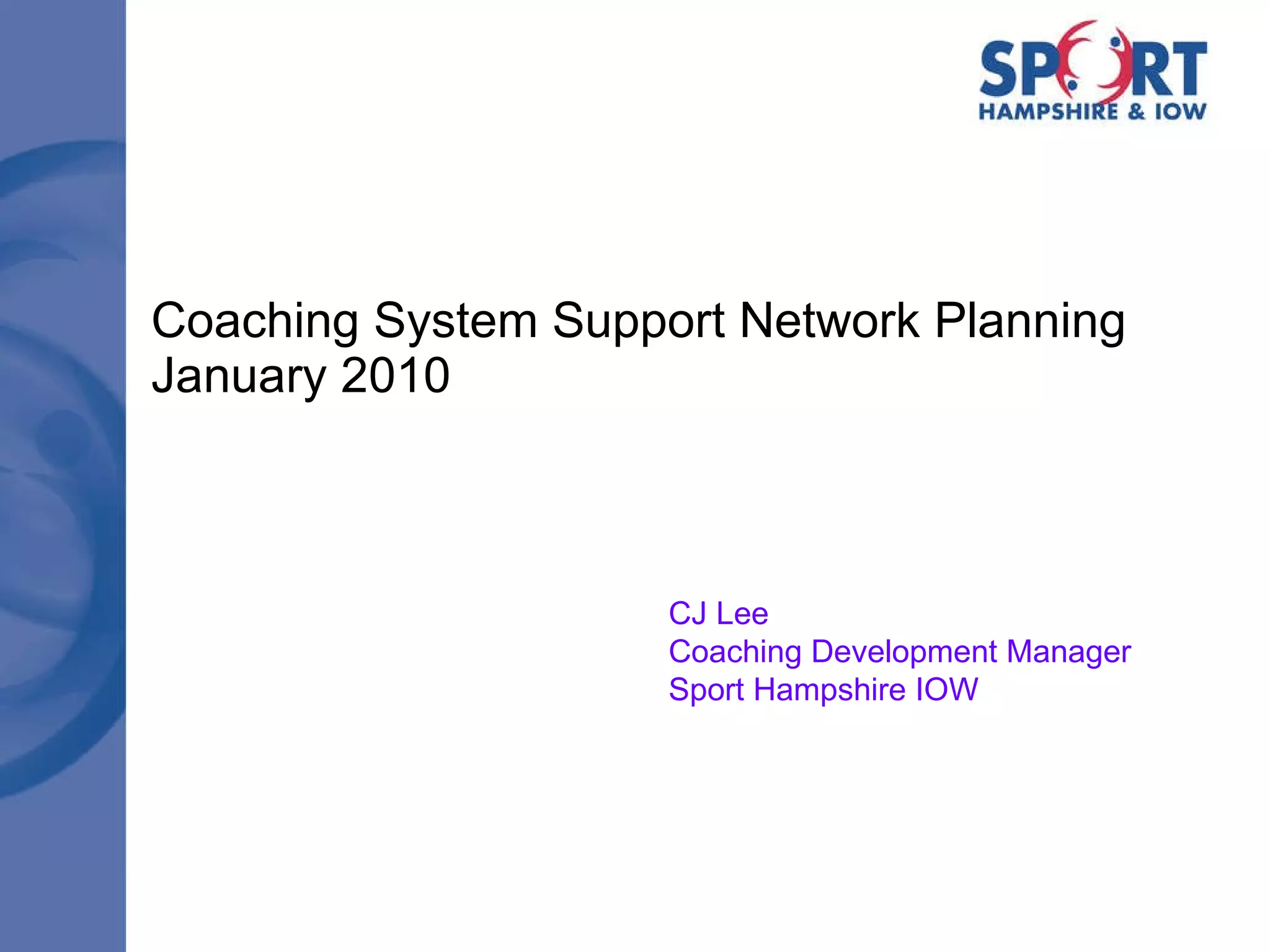 The document outlines plans for a coaching system support network across 49 County Sports Partnerships in England. It discusses agreements with Sport England to provide core coaching services including coach education, identifying funding opportunities for coaches, and coordinating support for coaches. The partnerships will each receive £41,800 annually to employ individuals to manage delivery of extended coaching functions to meet the needs of National Governing Bodies of sport based on their whole sport plans. The network will be coordinated nationally by Sport Coach UK and aims to develop local coaching communities, support coaches, and ensure consistent high quality delivery across England.