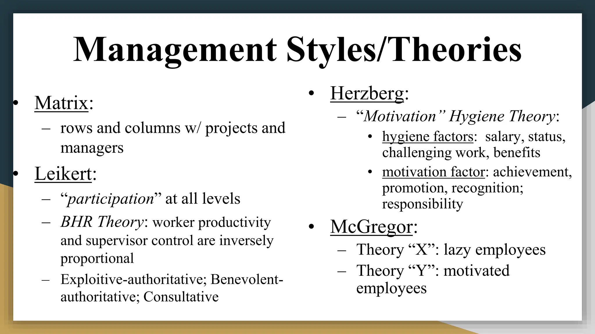 The document outlines various management styles and theories, emphasizing participation at all levels and the relationship between employee productivity and supervision. It discusses safety management principles, including accident causation theories and statistical analysis techniques to improve safety outcomes. Additionally, it covers statistical sampling and probability calculations relevant to management practices.