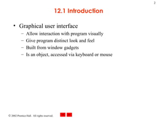 This document provides an outline and overview of Chapter 12 which covers graphical user interface (GUI) concepts in Windows Forms. The chapter introduces GUI components like windows, controls, properties, events and event handling. It describes common controls like labels, text boxes, buttons and how to set properties, handle events, and lay out controls on a form. Code examples are provided to demonstrate creating a simple form with a textbox, label and button to display text on a label when a button is clicked.