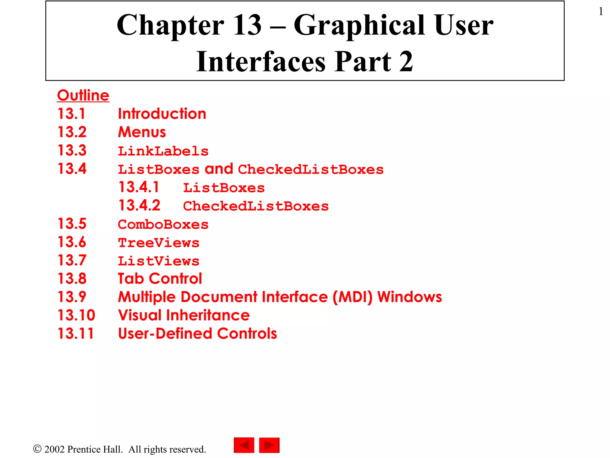 The document discusses various graphical user interface controls in C#, including menus, link labels, list boxes, combo boxes, tree views, and tab controls. It provides code examples to demonstrate how to implement menus with options to change font colors and styles, as well as link labels that link to other programs or files when clicked. Event handlers are used to handle user interactions with the controls.