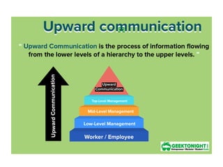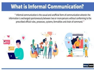 It defines communication as the exchange of information between two or more people through various methods. The communication process involves a sender encoding a message, selecting a channel to send the message through, the receiver decoding the message, and feedback. There can be barriers at each stage of the process.