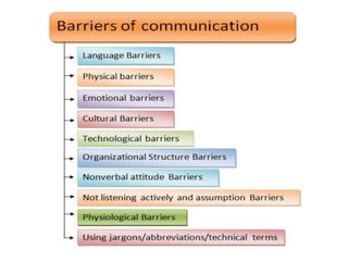 This document discusses various aspects of communication including the definition of communication, the communication process, types of communication (verbal, non-verbal, written), barriers to communication, and skills related to communication such as listening, speaking, reading, and writing.