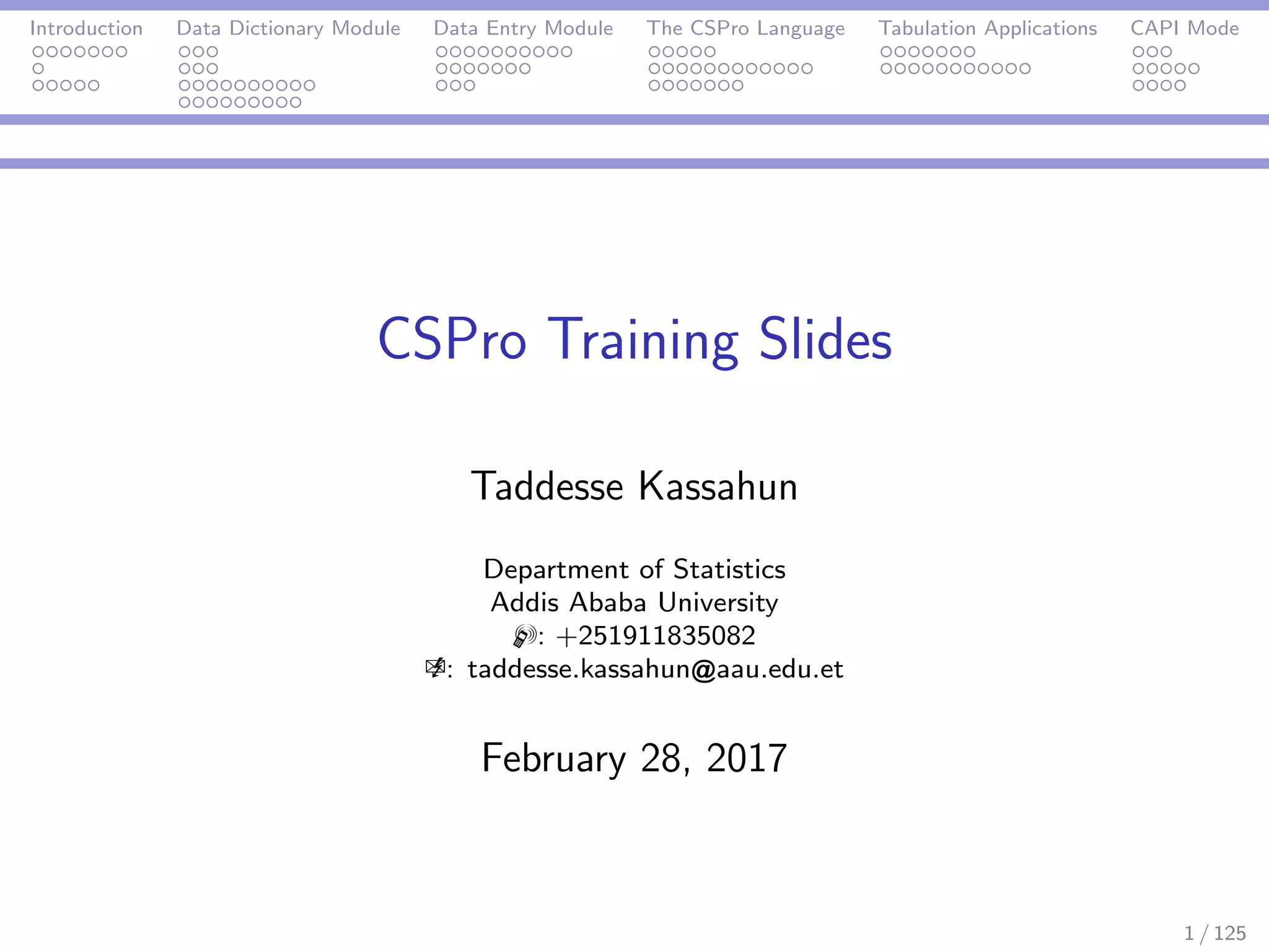 The document provides an overview of the Census and Survey Processing System (CSPro), a software package used for data entry, editing, tabulation, and dissemination of census and survey data. It details modules available in CSPro, including data entry, batch editing, and tabulation applications, and describes the structure and creation of data dictionaries and data files. CSPro is a free public domain product designed for use on Windows operating systems, utilized by various institutions such as national statistical offices and NGOs worldwide.