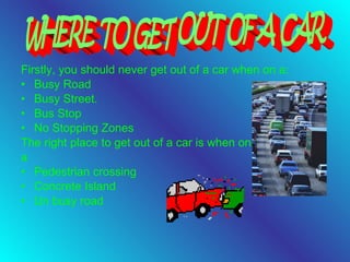 1) When getting out of a car, only do so in pedestrian crossings, concrete islands, or unbusy roads to avoid traffic.
