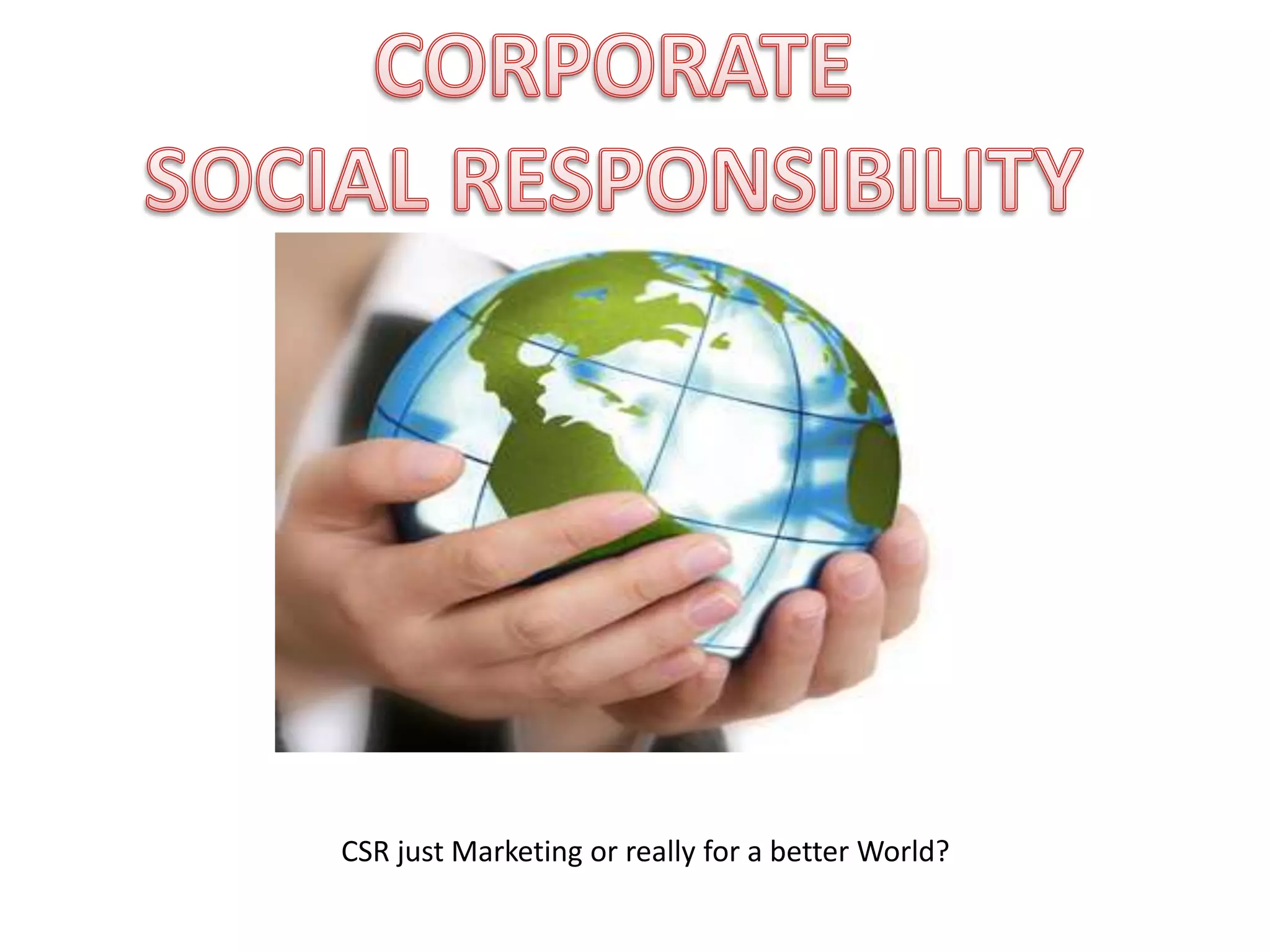 Corporate social responsibility (CSR) refers to businesses taking responsibility for their impact on society beyond short-term profits. While CSR has existed for a long time, it grew in prominence in the late 20th century as expectations increased that businesses should address social and environmental issues. There are arguments both for and against CSR, but increasingly companies see value in CSR for reputation and attracting ethical consumers. In India, large companies commonly engage in CSR activities, though some see it more as public relations than meaningful contribution to society.