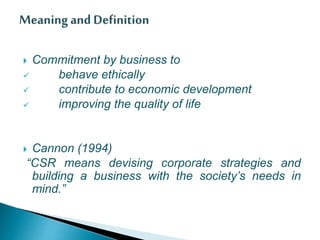 This document defines corporate social responsibility (CSR) as a commitment by businesses to behave ethically and contribute to economic development and improving quality of life. It states that CSR involves balancing economic, legal, ethical, and philanthropic responsibilities. The document outlines businesses' responsibilities to various stakeholders like employees, customers, suppliers, the community, and government. It discusses how fulfilling CSR can benefit businesses through improved financial performance, reputation, productivity and gaining a competitive advantage.