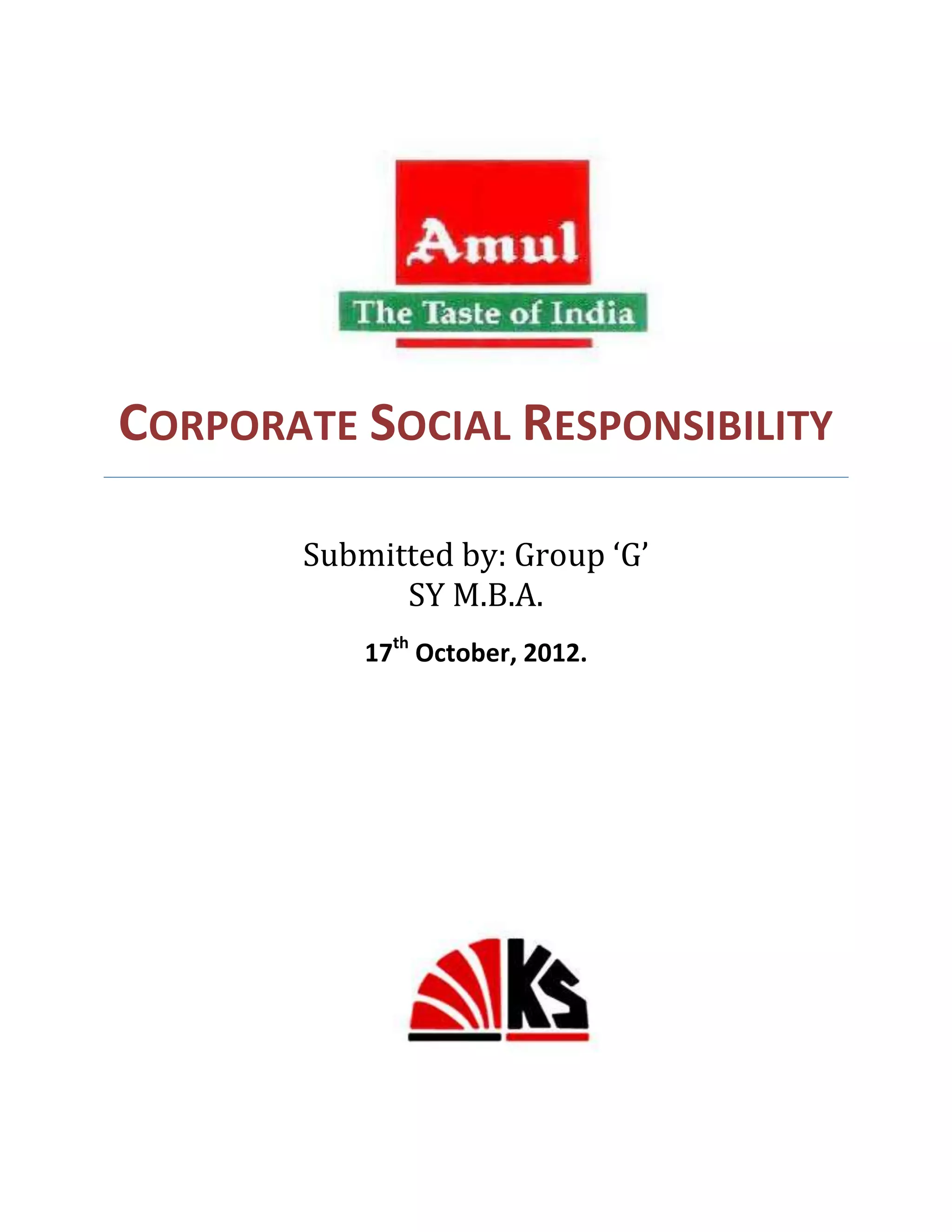 This document summarizes the corporate social responsibility efforts of Amul, an Indian dairy cooperative. It discusses Amul's history beginning in 1946 with a goal of serving milk producers and providing quality, affordable products to consumers. Amul's CSR initiatives include forming relief funds to aid earthquake recovery, conducting large-scale tree planting campaigns, empowering women through cooperative participation, and awarding scholarships to academic achievers. The conclusion emphasizes Amul's leadership, values, networks, coordination, and technology have enabled its successful CSR programs.