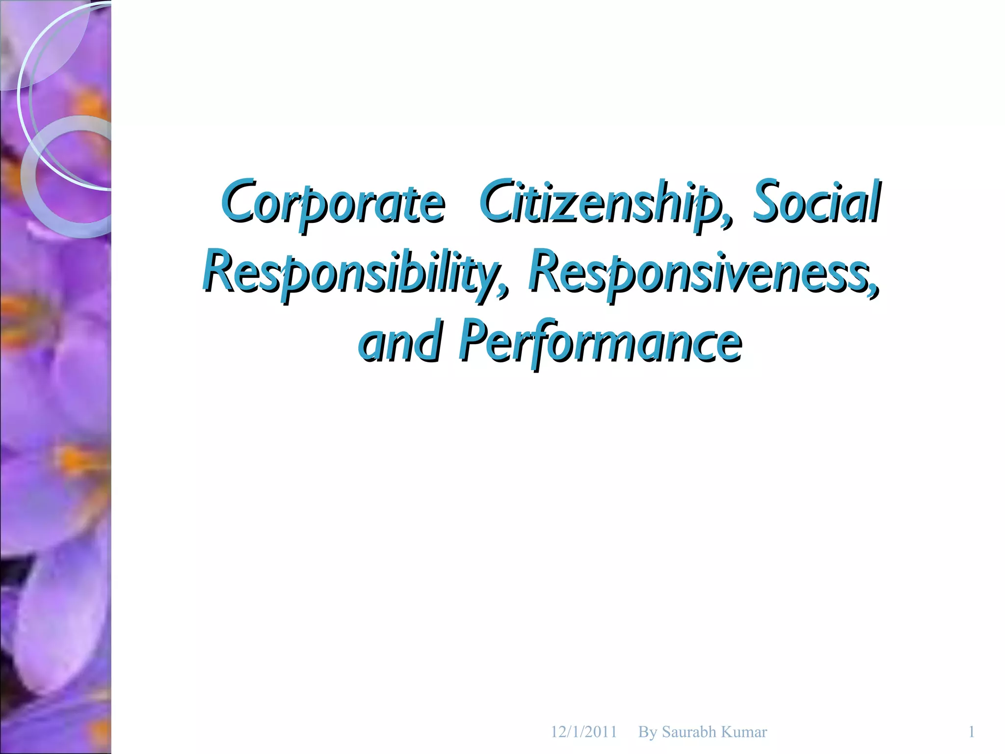 The document discusses the concepts of corporate social responsibility (CSR), social responsiveness, and social performance. It provides definitions and frameworks for understanding a company's responsibilities and obligations to society beyond profit and legal compliance. Carroll's four-part definition of CSR as encompassing economic, legal, ethical, and discretionary expectations is discussed.