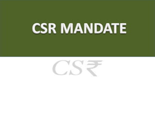 India has recently mandated that large companies must spend 2% of their net profits on corporate social responsibility (CSR) initiatives, entering an "Era of Command and Control" for CSR. CSR has evolved in India from being based on traditional values to becoming integrated with business strategy. The mandate applies to companies meeting certain net worth, turnover, or profit thresholds and requires CSR spending in areas like education, healthcare, and environmental sustainability. While the mandate may increase funding for social causes, some negative impacts are that companies may treat CSR as merely compliance or "checking the box" rather than strategically addressing social and environmental issues. The presentation provides an overview of India's new CSR framework and procedures for companies to develop CSR committees, allocate 2
