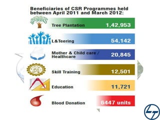 L&T has a long history and presence across India. Their CSR strategy focuses on health, education, environment, and disaster response. They take a 3 P approach - principles, processes, and projects. For a new contract in Odisha, they propose a new initiative called "UttHaan" targeting tribal communities. Over 3 years, they will invest 15 crores in infrastructure, healthcare, education, and environment focusing on issues those communities face like lack of access, awareness, and facilities. The initiative aims to overall develop the tribal community through a multi-pronged approach.