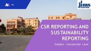 This document discusses corporate social responsibility (CSR) and sustainability reporting. It defines CSR as a self-regulating business model that helps companies be socially and environmentally responsible. The document outlines the main types of CSR which include environmental, ethical, philanthropic, and financial responsibility. It then defines sustainability reporting as communicating a company's economic, environmental, and social impacts and performance. The benefits of sustainability reporting are that it increases understanding of risks and opportunities, emphasizes the link between financial and non-financial performance, and helps avoid failures related to environmental, social, and governance issues.