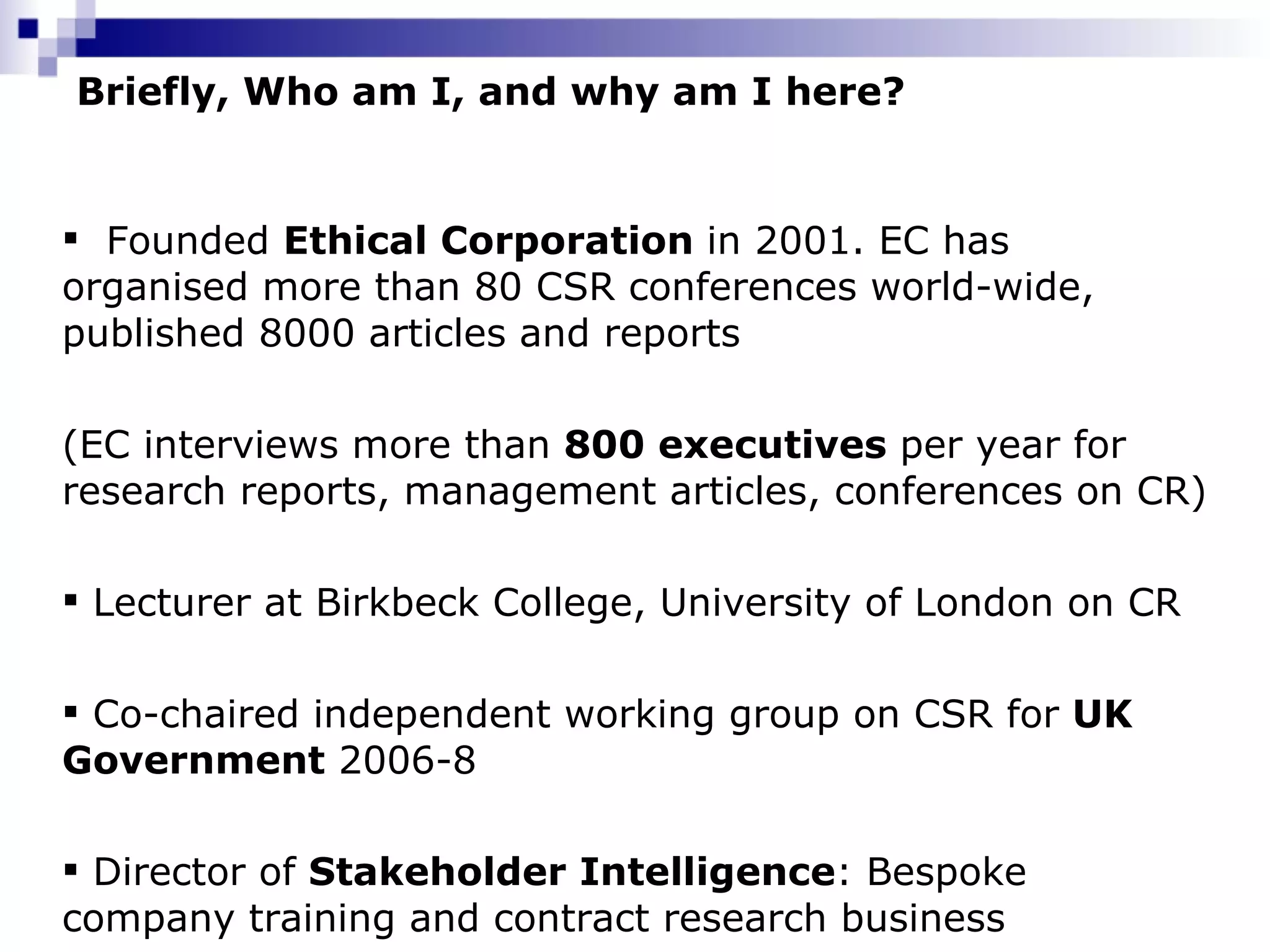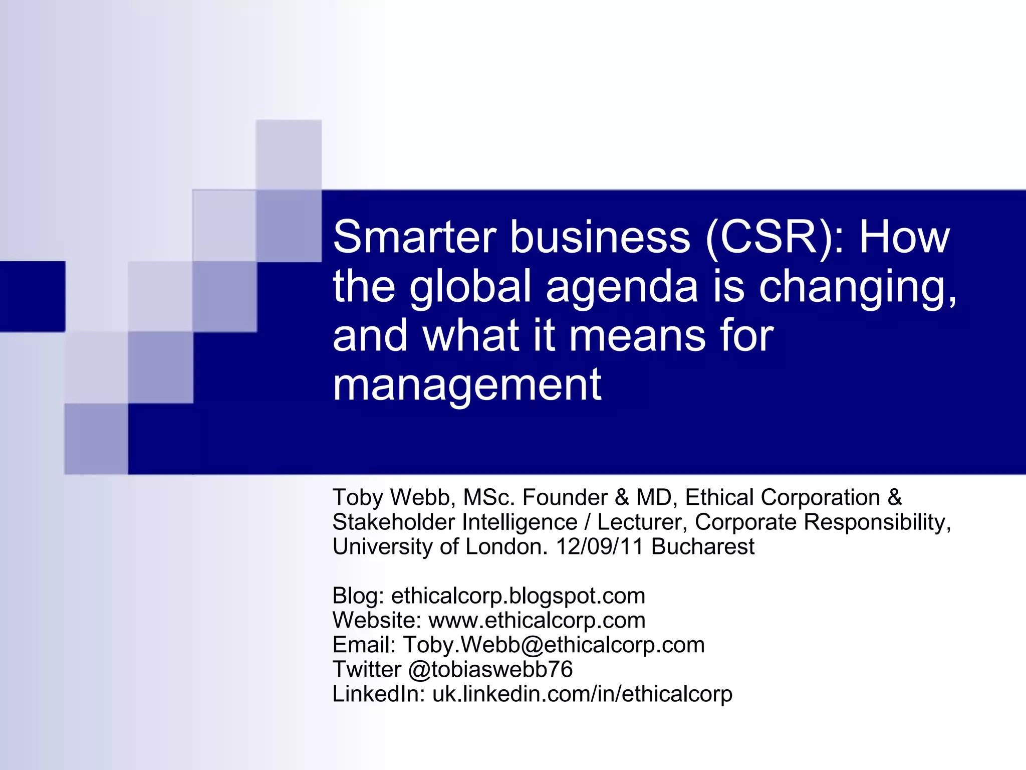 The document outlines how changing global agendas are influencing corporate social responsibility (CSR) management, emphasizing the need for businesses to adapt to economic, environmental, and social trends. Key themes include the importance of collaboration, corporate reputation, and the evolving regulatory landscape in the EU, particularly concerning transparency and non-financial disclosures. It also discusses the nine key elements of the modern business case for CSR, highlighting how these practices can lead to better organizational performance and stakeholder engagement.