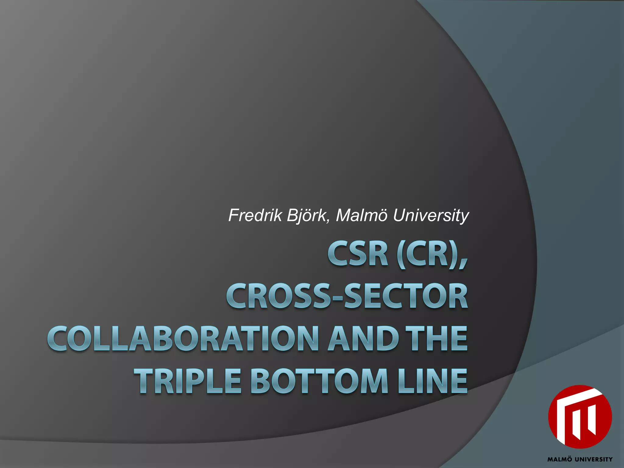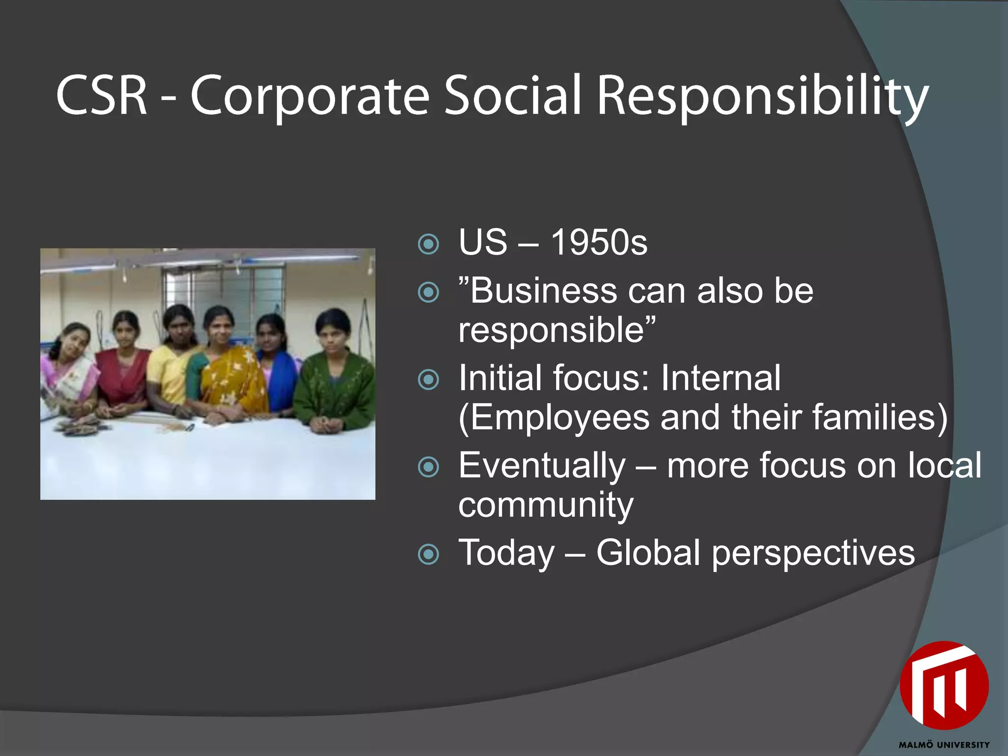 The document discusses the history and evolution of corporate social responsibility (CSR) from focusing internally in the 1950s to now having a global perspective. It examines what is meant by "social" and how CSR now encompasses ethics, social issues like diversity, and environmental issues. The document also explores sustainability megatrends like climate change that present risks and opportunities for business and how CSR and cross-sector collaboration can help address large challenges.