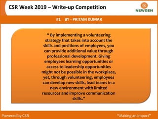 The document discusses the importance of volunteering and corporate social responsibility (CSR) through a competition held during CSR Week 2019, highlighting the contributions of several participants. Each submitted piece emphasizes the positive impacts of individual and collective actions in society, including fostering education, environmental awareness, and social care. The collective message advocates for more active engagement in CSR initiatives as a means of personal growth and societal improvement.