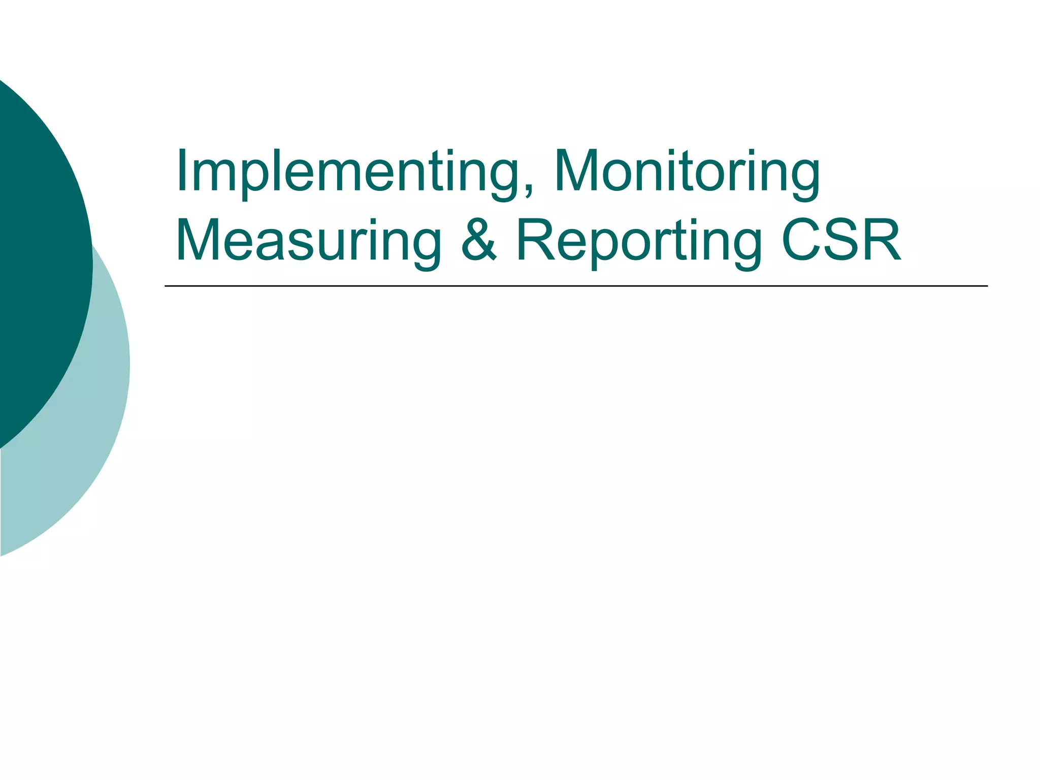 Implementing, monitoring, and reporting CSR requires identifying a company's CSR level, key requirements like commitment and resources, and operational steps. CSR should be operationalized through forming a motivated core group to identify focus areas, design action plans, monitor impacts, and report initiatives. Measuring, monitoring, and reporting CSR ensures accountability, avoids risks, and improves reputation and performance. It involves using tools like ratings, principles, and indices to benchmark performance across areas like workplace, environment, and community initiatives. Reporting provides transparency and drives progress through methods like descriptive, quantitative, full cost, and triple bottom line reporting.
