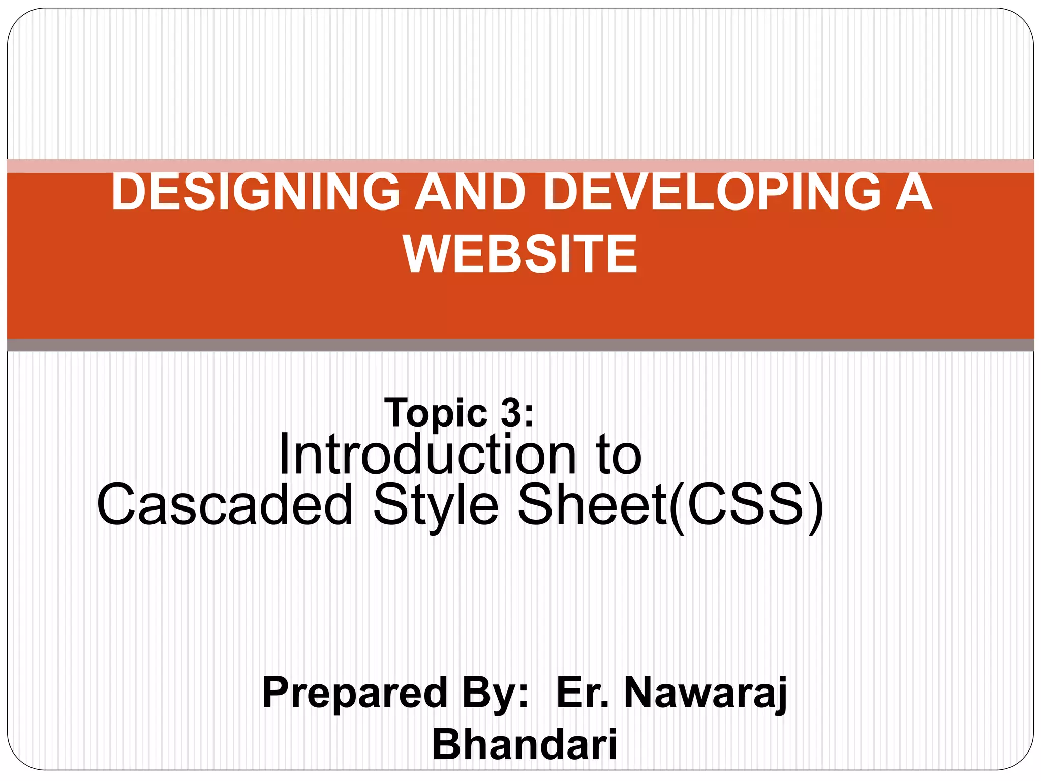 Cascading Style Sheets (CSS) allow the separation of document structure (HTML) from presentation (styles). CSS is applied to HTML using style rules composed of selectors and declarations. There are three main ways to apply CSS - inline with the HTML, internally via <style> tags, or externally in separate .css files. CSS properties control text styling, box model properties like width/height, and other visual aspects of HTML elements. CSS selectors target elements by type, class, ID, and other attributes to style them appropriately.