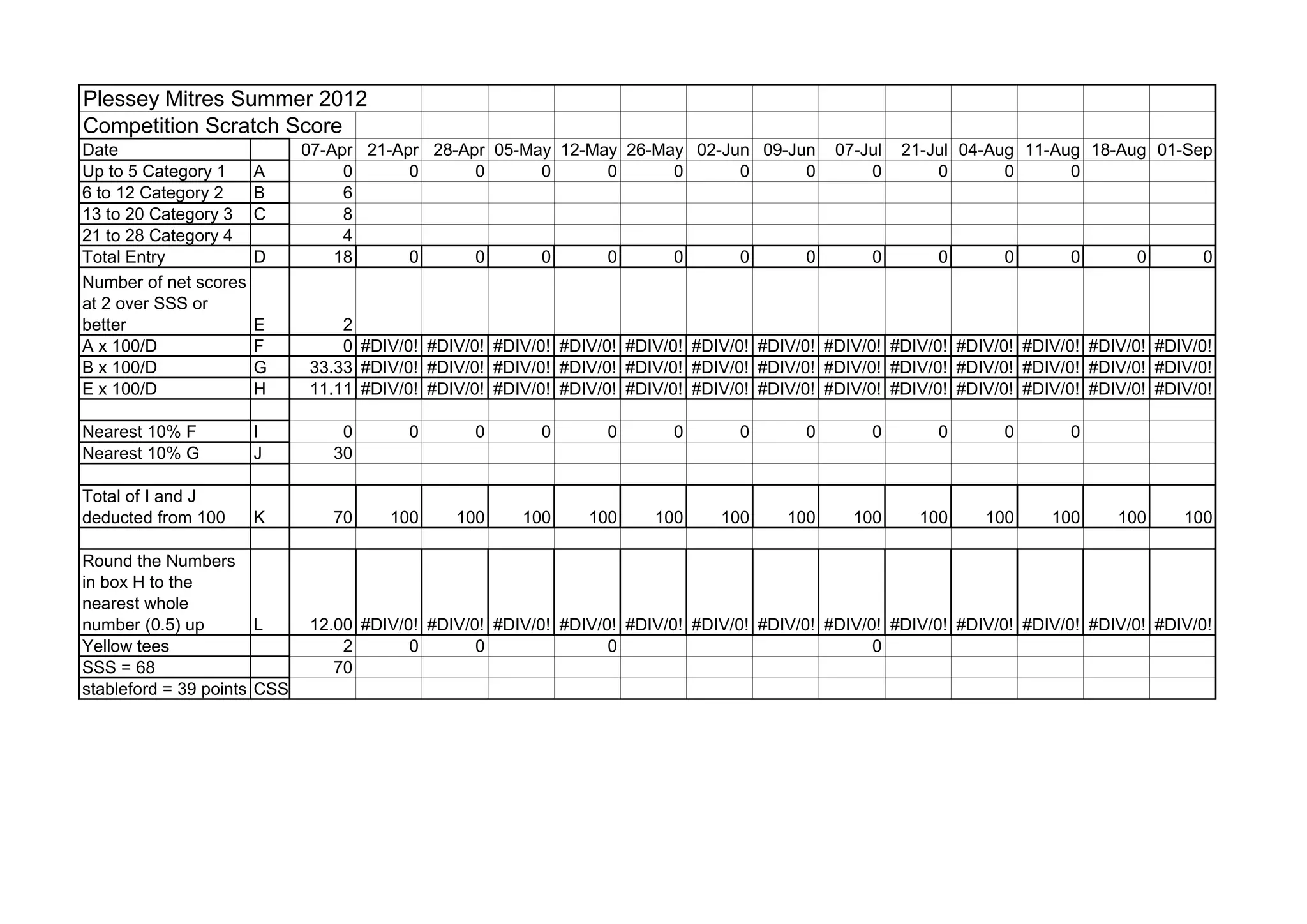 This document tracks golf competition scores over multiple dates from April to November. It shows the number of entries in different scoring categories each date. On the first date, there were 18 total entries, with 6-12 scoring in Category 2. This represented 33.33% of the total entries. There were also 2 scores that were at least 2 over the course rating.