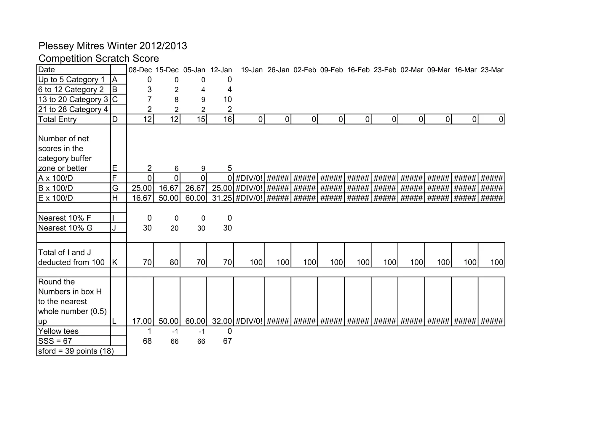 This document shows scoring data for a golf competition across multiple dates from December to March. It tracks the number of entries in different scoring categories by date, along with calculation of percentages of entries in each category scoring at or above a buffer zone. The total percentages are deducted from 100 to determine a scratch score, which is rounded and may be adjusted up or down based on additional criteria to determine a final Stableford points score.