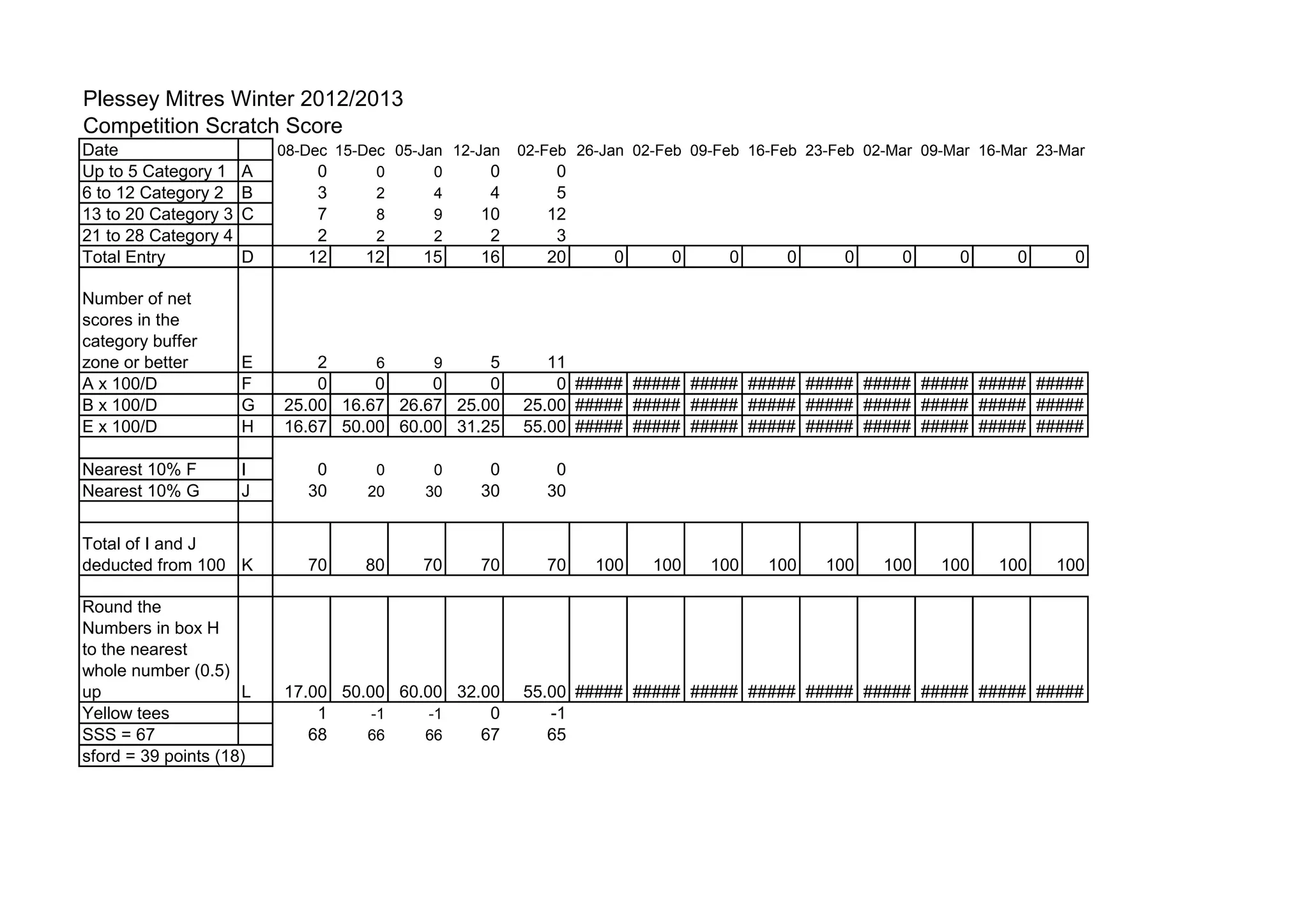 This document contains scoring information for a winter golf competition across multiple dates from December to March. It shows the number of entries in different scoring categories for each date, along with calculations of percentages of entries in each category and a total scratch score. The totals are used to determine buffer zone scores and rankings.