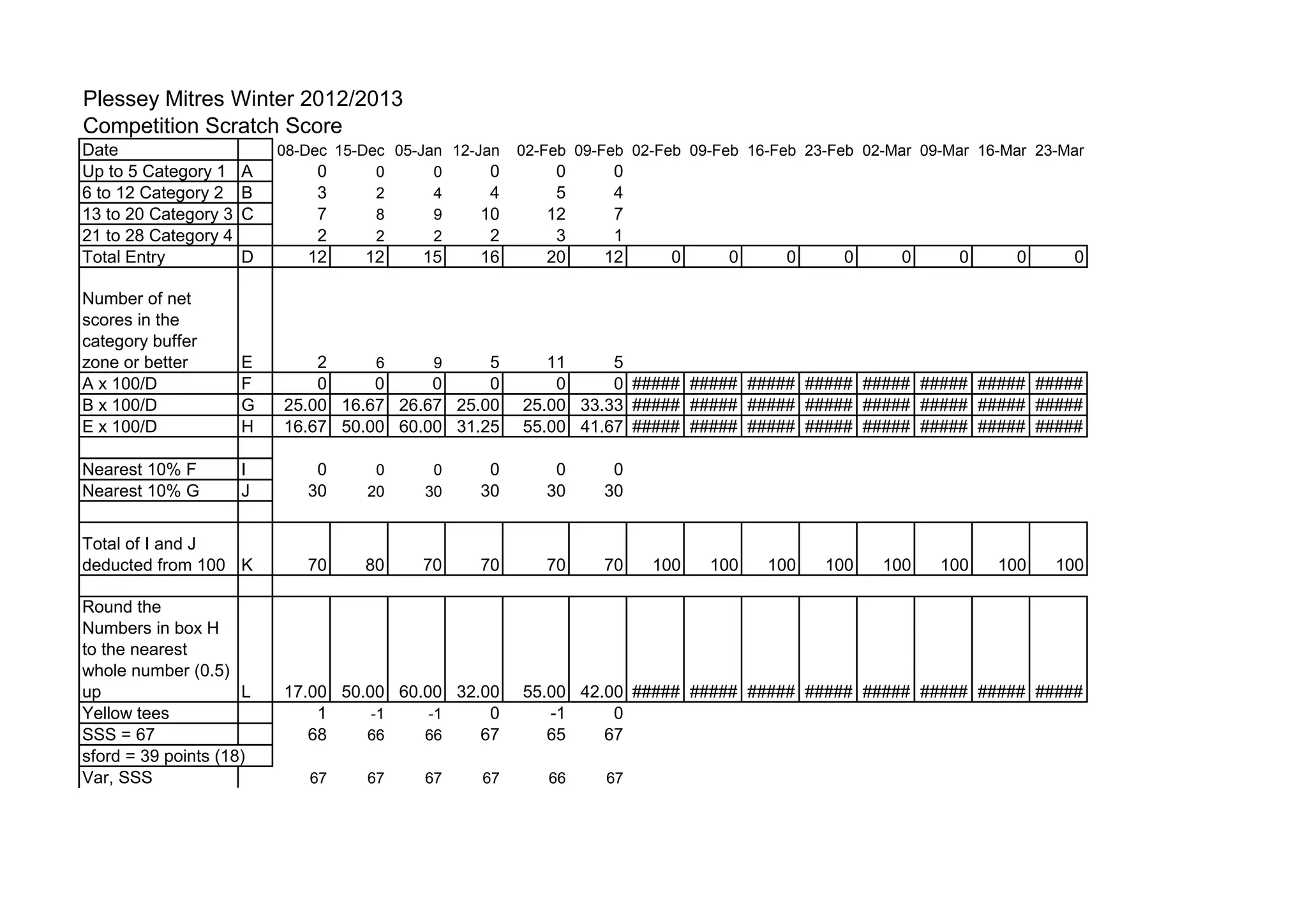 The document contains competition scores for the Plessey Mitres Winter 2012/2013 scratch scores over multiple dates from December to March. It shows the number of entries in different scoring categories each date, along with calculations of the percentages of entries in each category and the percentages that scored in a buffer zone or better. The bottom section contains additional competition details like course yardages played from and overall Stableford scoring averages.