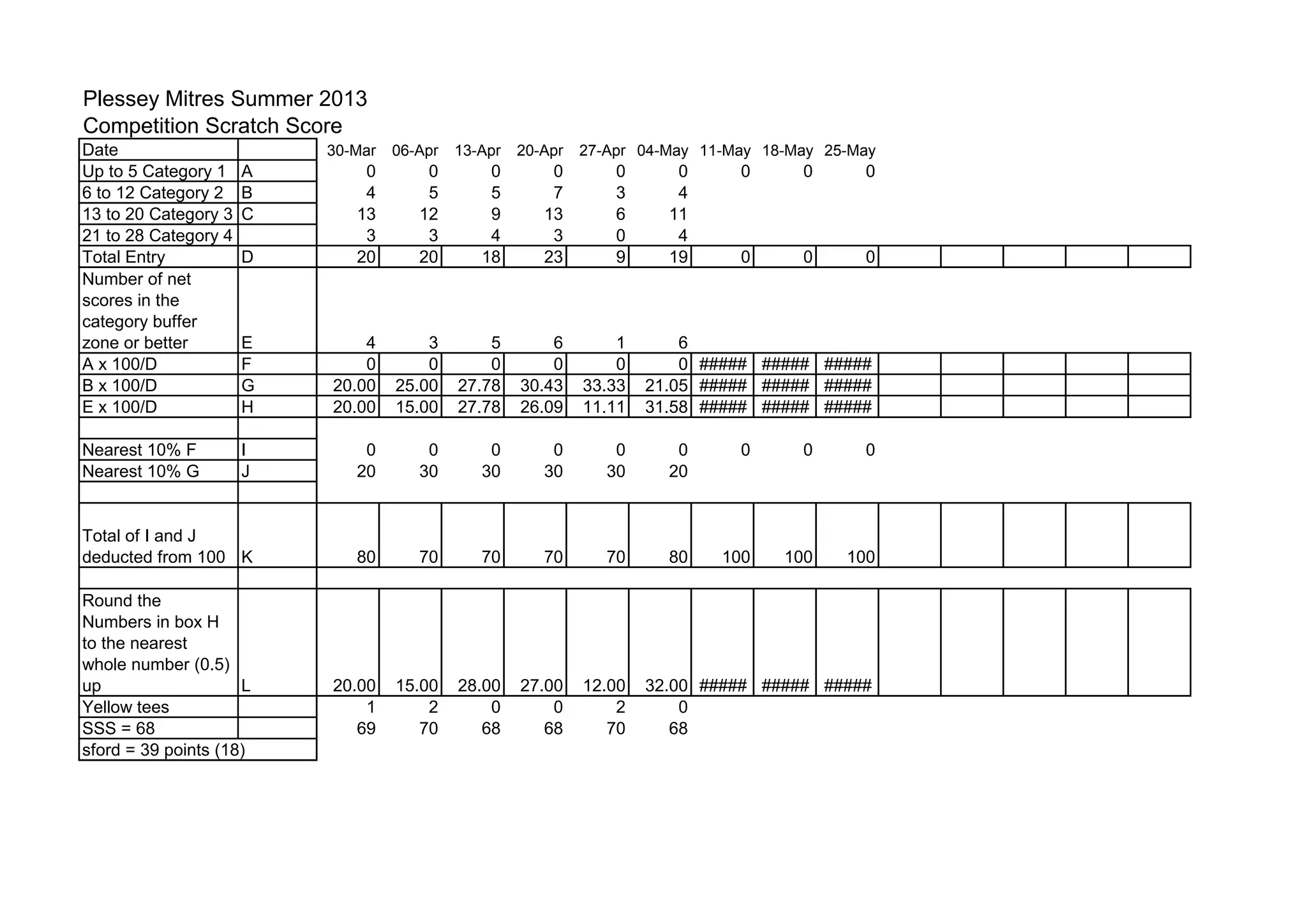 1) The document provides weekly scratch scores for a golf competition across multiple categories from March 30th to May 25th.
