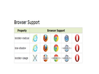 CSS3 introduces several new properties for styling backgrounds and borders in CSS. Some of the key new properties include border-radius for rounded corners, box-shadow for drop shadows, border-image for image borders, background-size for sizing backgrounds, and multiple backgrounds to use more than one image. Browser support for CSS3 is improving, with most modern browsers now supporting the new CSS3 background and border properties.