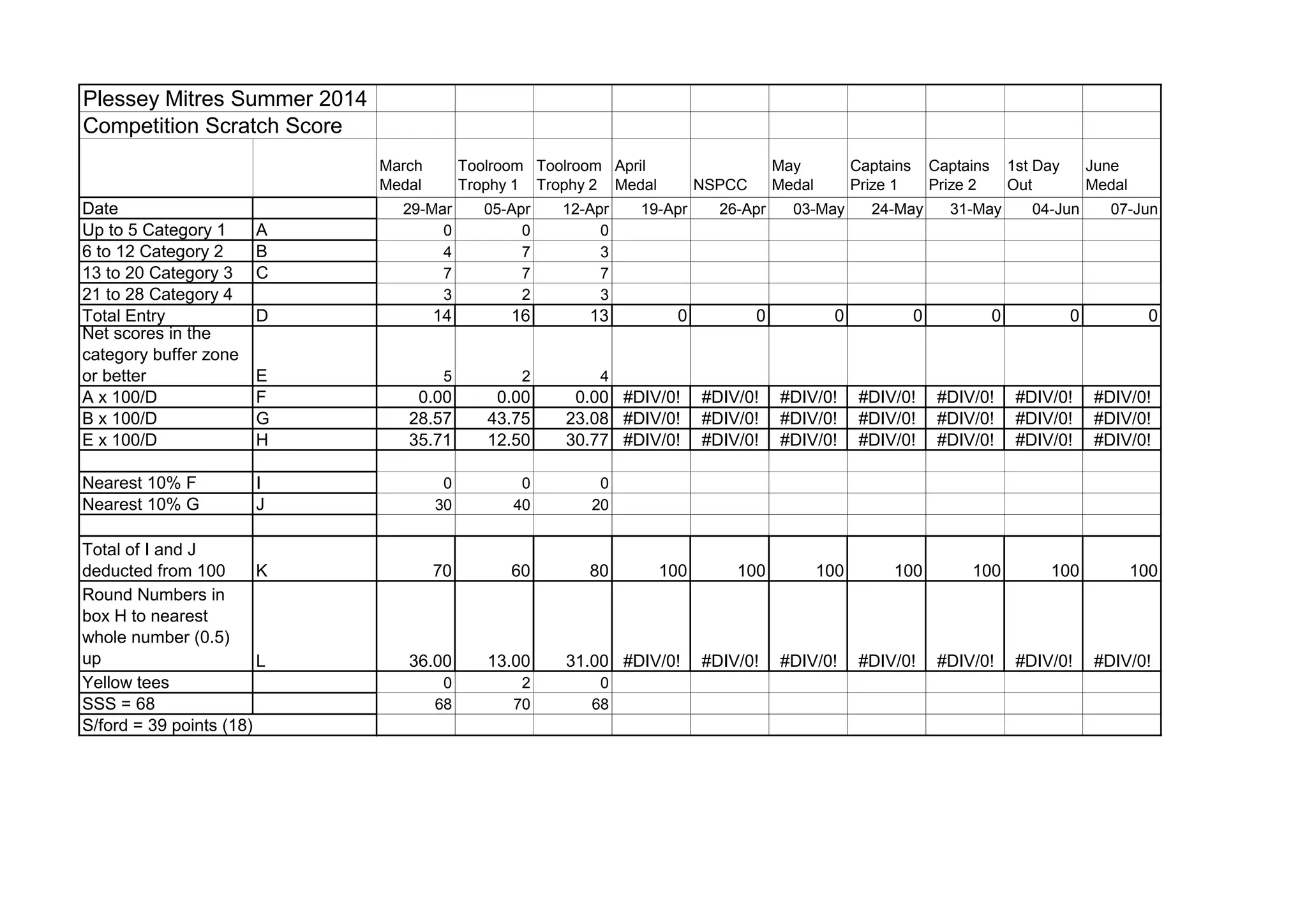 The document appears to be a scorecard for golf competitions held by Plessey Mitres between March and November. It tracks medal and trophy competitions on specific dates, lists categories based on scores, and calculates percentages and points for each competition. Awards included medals, trophies, and prizes for different categories on different dates throughout the period.