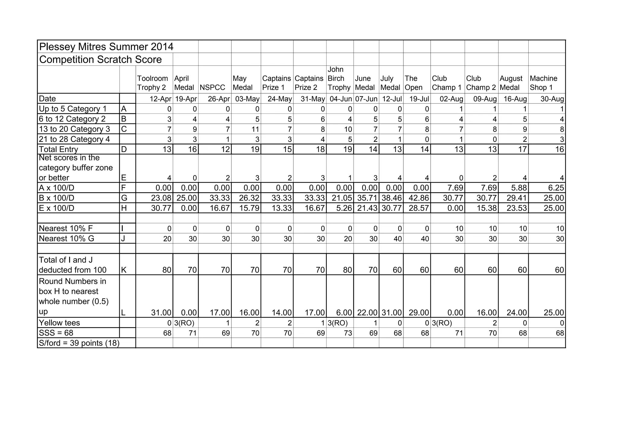 This document summarizes the results of golf competitions held by Plessey Mitres over the summer of 2014. It includes the dates and names of 14 different competitions held between April and November. For each competition, it provides data on the number of participants in different handicap categories, the percentage of scores in certain ranges, and the Stableford and Scratch scores achieved.