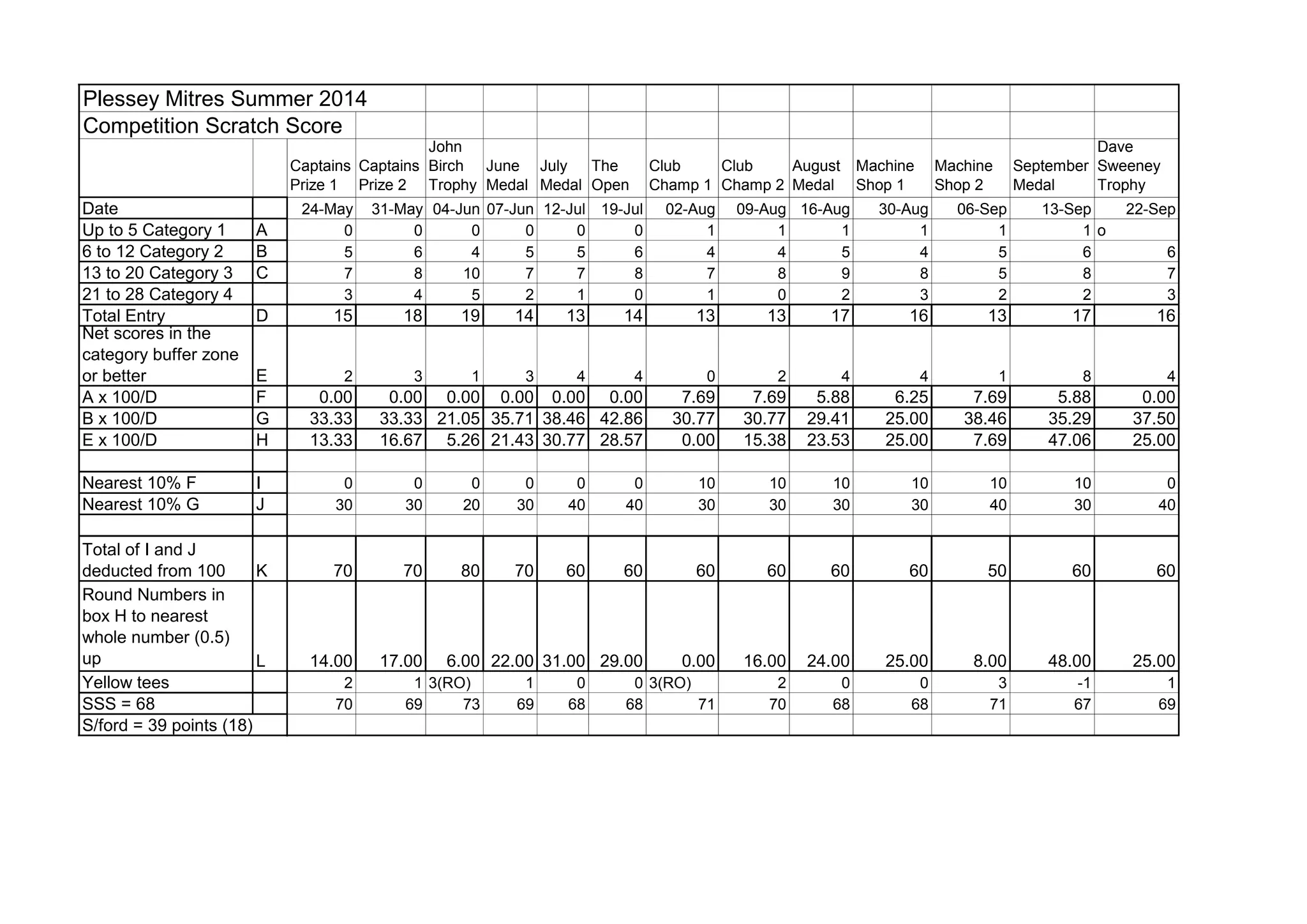 This document contains records of golf competitions held at Plessey Mitres over the summer and fall of 2014. It lists the name and date of each competition and records statistics like the number of participants in different handicap categories, percentages of categories, scores, and winners. In total, it provides results and analysis for 24 separate golf tournaments.