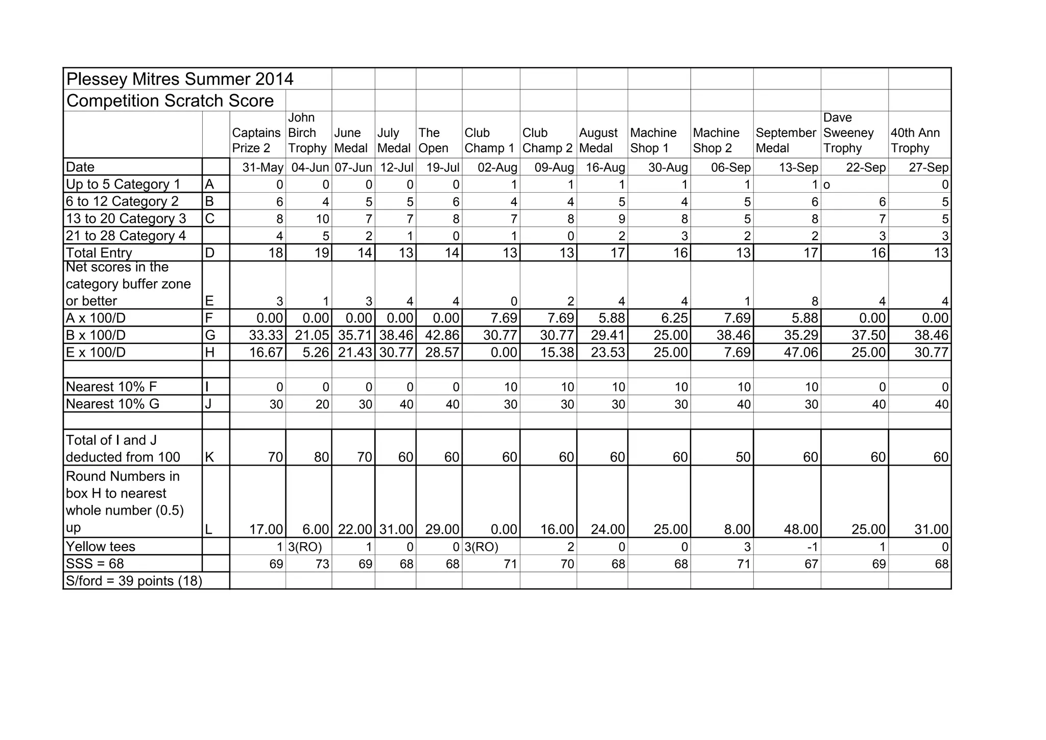 The document appears to be records from a golf club listing various competitions held between May and October. It includes the competition name, date, number of entries in different handicap categories, scores and results. The tables show player participation levels, handicap distributions of finishes, course ratings and adjusted scores for competitions over this time period.