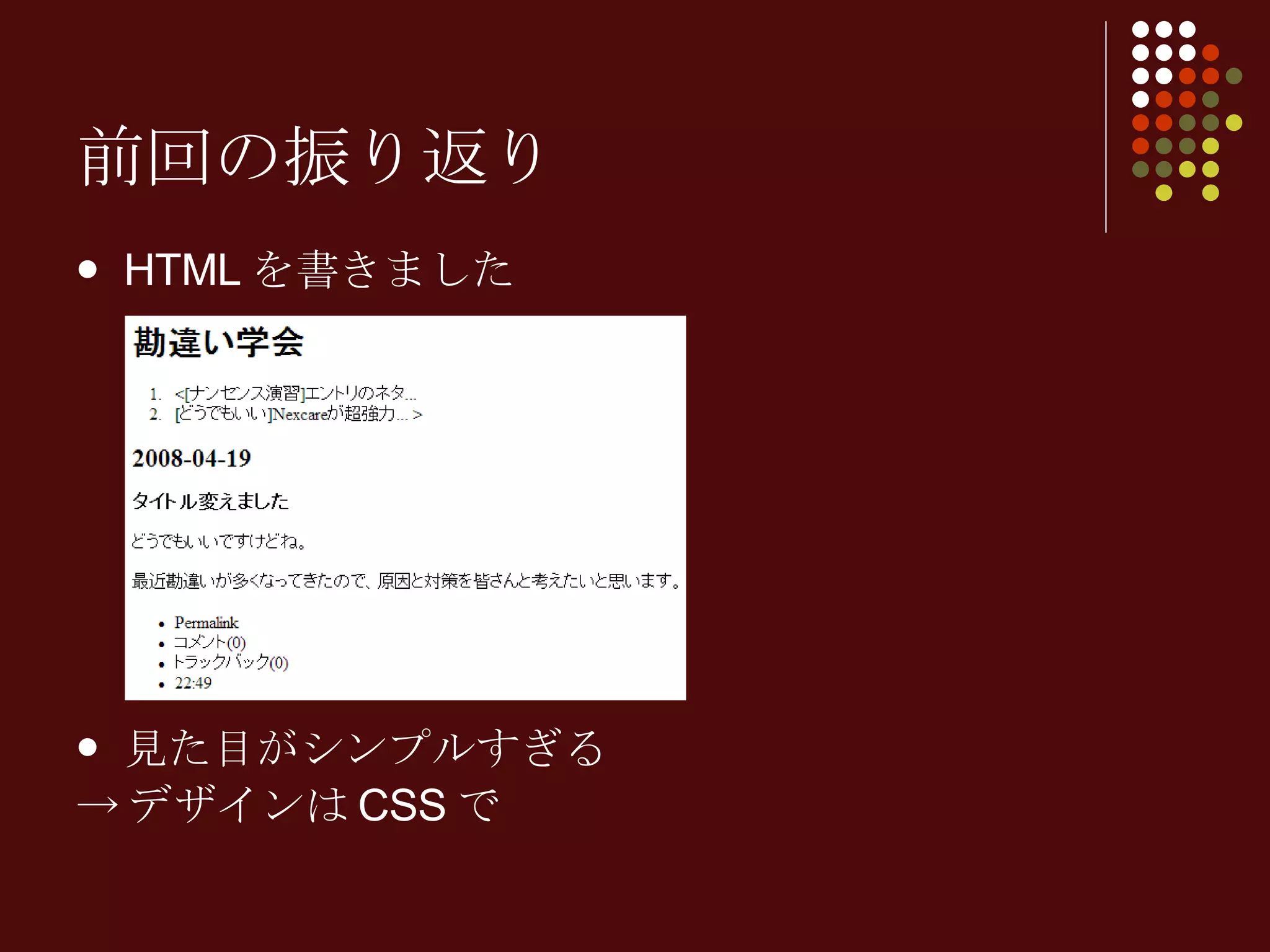 CSSって何? <h1> 勘違い学会</h1> が ( 大きくて太いフォントに改行 ) と表示されるのは、ブラウザのデフォルトシートの効果 h1 { display: block; font-size: 2em; margin: .67em 0; font-weight: bolder; } (http://www.w3.org/TR/CSS21/sample.html を元に作成 ) - 6.