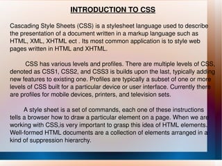 The document discusses the basics of Cascading Style Sheets (CSS), including its syntax, selectors, properties for styling text, links, backgrounds, and positioning elements. CSS is a stylesheet language that allows styling and layout of web pages written in HTML and other markup languages to specify things like colors, fonts, spacing and positioning of elements.
