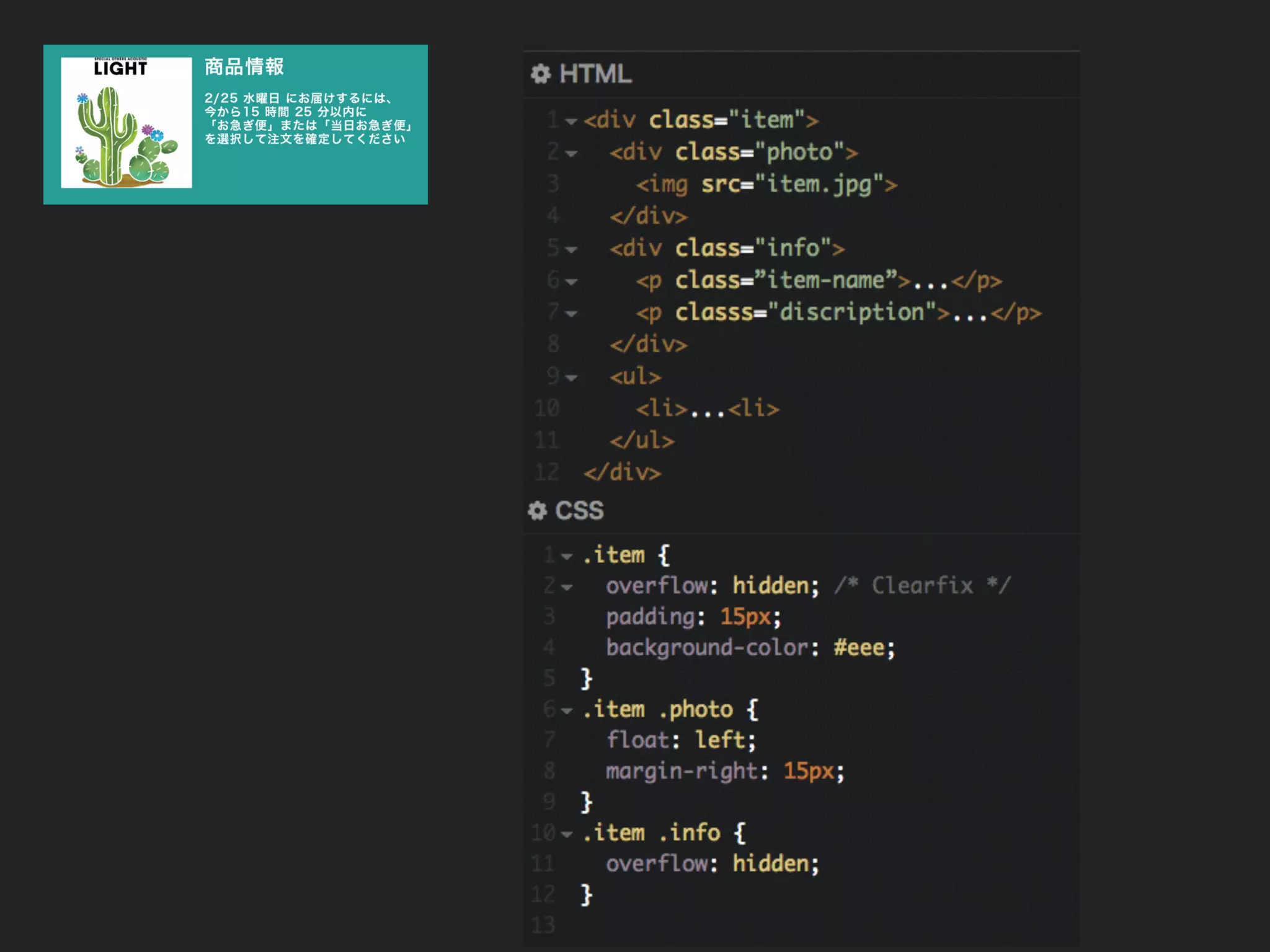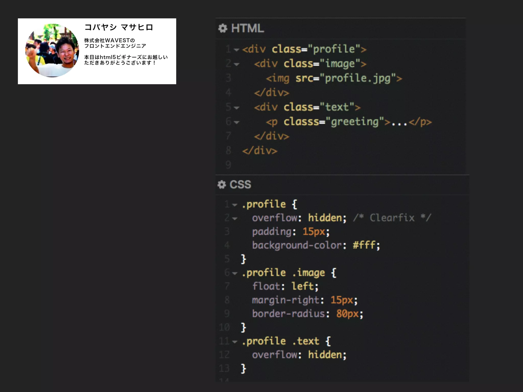 /* Clearfix */ padding: 15px; background-color: #eee; } .item .photo { float: left; margin-right: 15px; } .item .info { overflow: hidden; } …… .profile { overflow: hidden; /* Clearfix */ padding: 20px; background-color: #fff; } .profile .image { float: left; border-radius: 80px; margin-right: 15px; } .profile .text { overflow: hidden; } ……