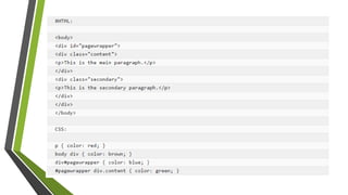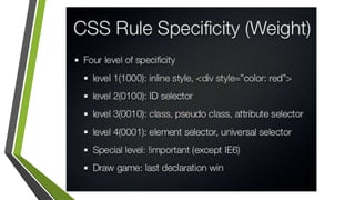 The document discusses various topics related to HTML, CSS, and client-side coding including: CSS selectors, properties, cascade, media queries, animations. It covers CSS syntax, selectors like type, ID, class, attribute, and pseudo selectors. It describes the box model and properties for text, background, positioning. It also explains cascade, specificity, inheritance in CSS and how media queries allow styling for different devices.