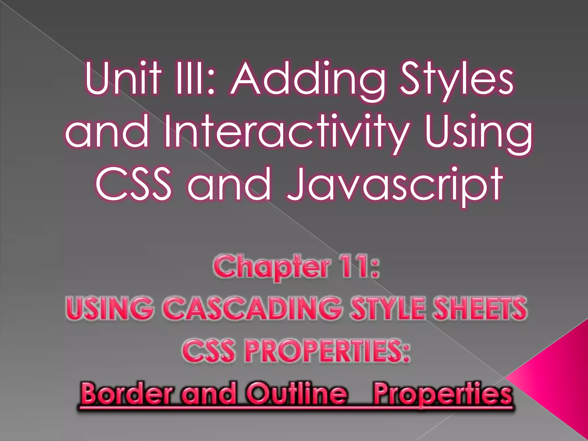 The document discusses how to add styles and interactivity to elements using CSS and JavaScript. It provides information on CSS border properties that specify borders around elements, as well as outline properties that specify outlines. Examples are given for setting various border styles, widths, colors and more using CSS syntax.