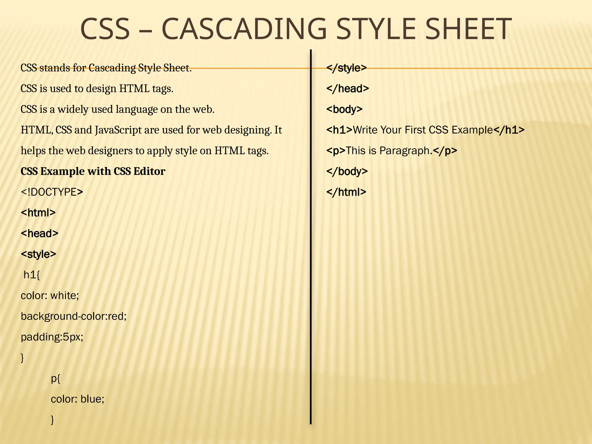 The document provides an overview of Cascading Style Sheets (CSS), detailing its function in web design and features various types such as inline, internal, and external CSS along with examples. It describes CSS selectors, which are used to apply styles to HTML elements, and includes information on CSS colors, backgrounds, and properties like borders. The document also illustrates CSS syntax and examples, showcasing how styles can be applied to webpages.