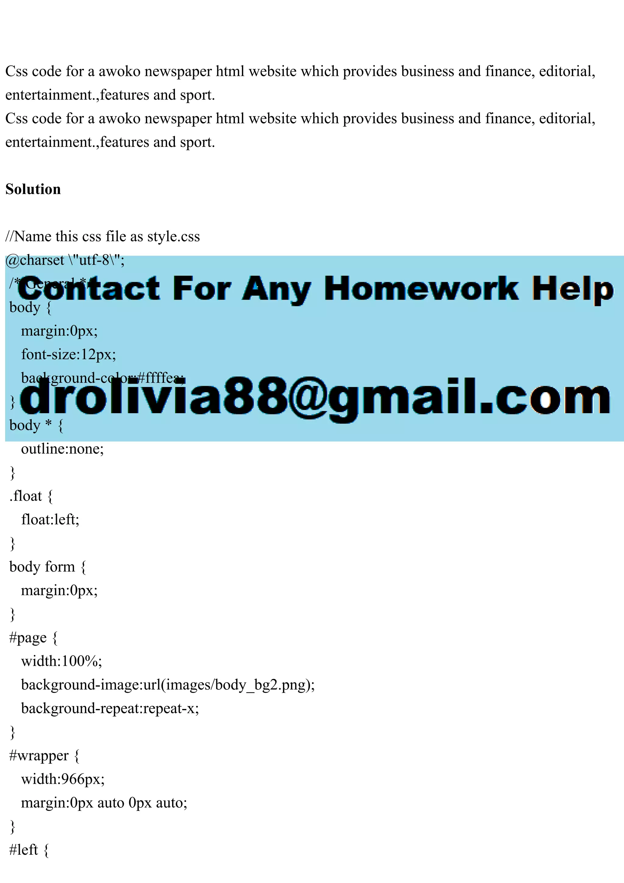 The document contains CSS code for the styling of an Awoko newspaper HTML website, which focuses on business, finance, editorial content, entertainment, features, and sports. It includes various styling elements for layout, headers, columns, sidebars, and footer, ensuring a structured and visually appealing format. Additionally, it suggests creating an HTML file named index.html to serve as the main page of the site.