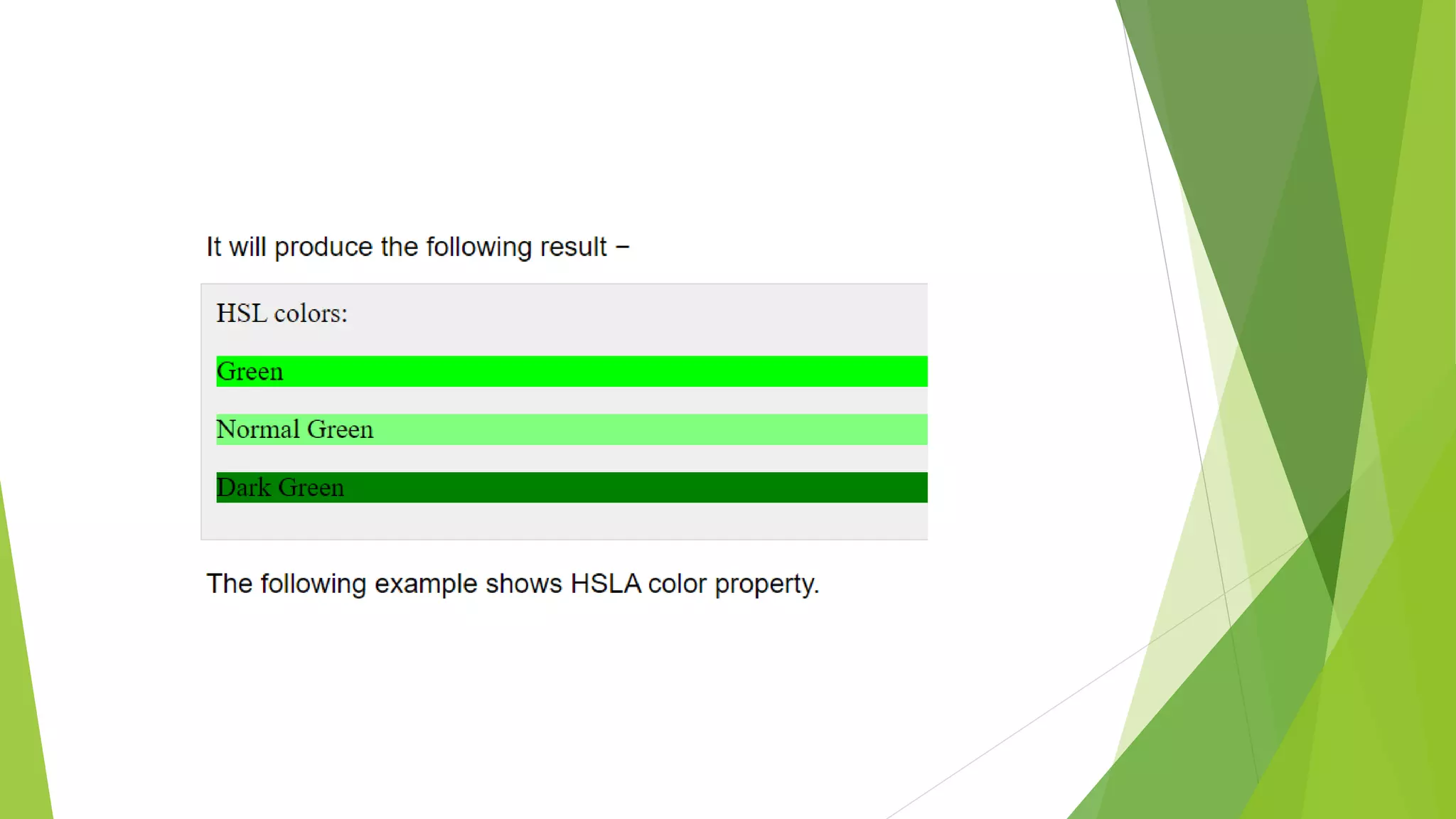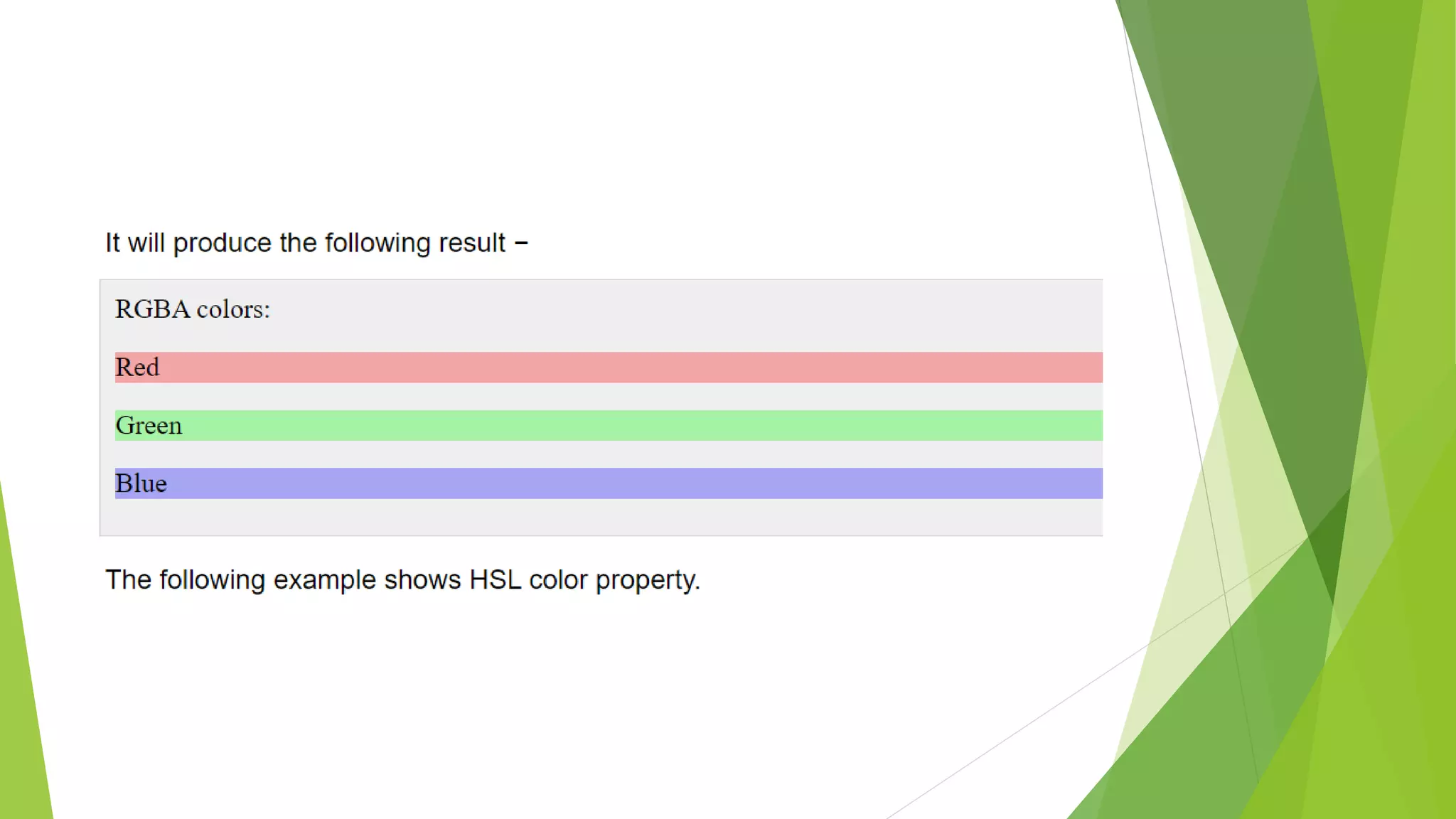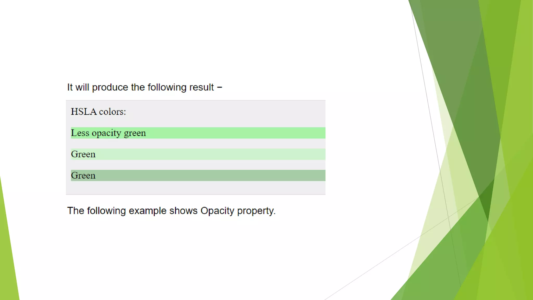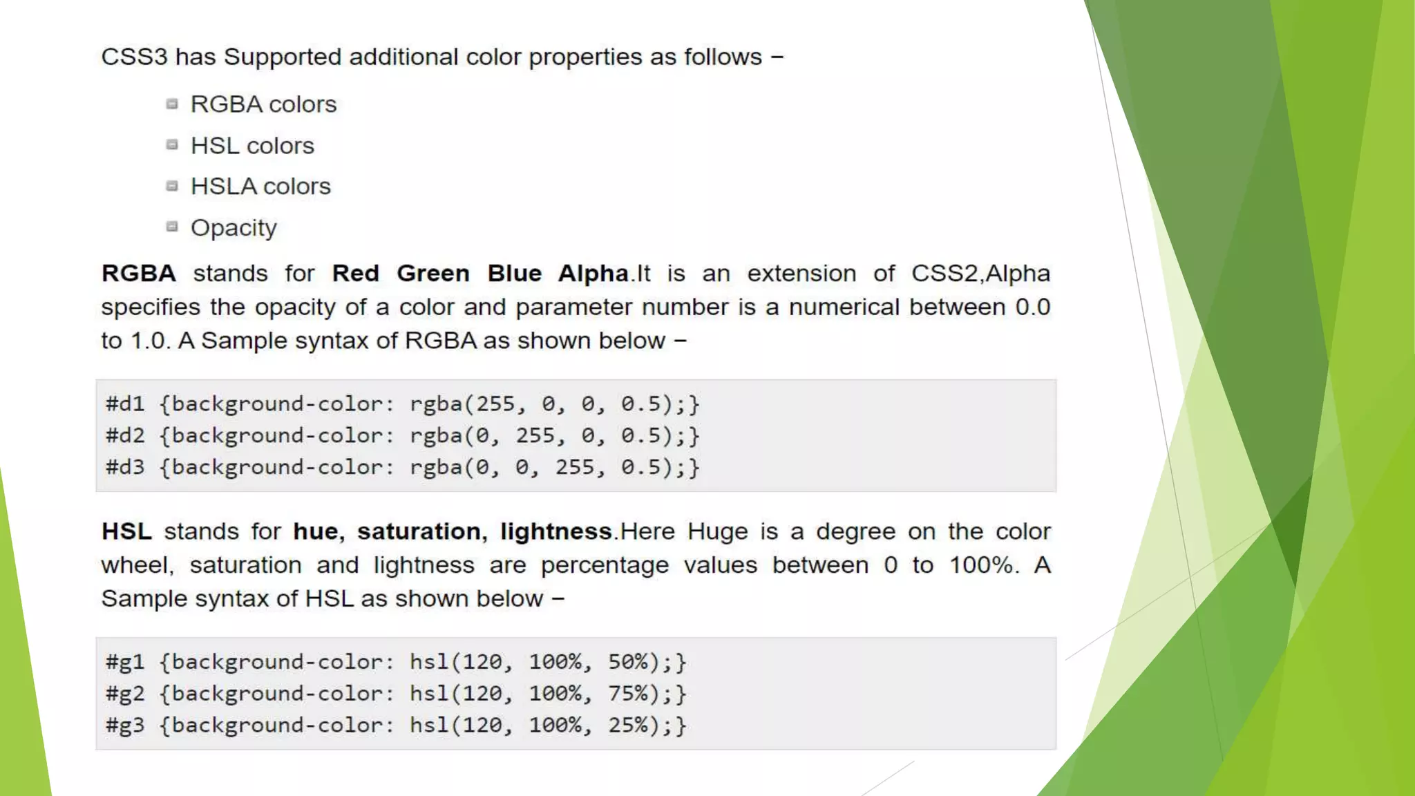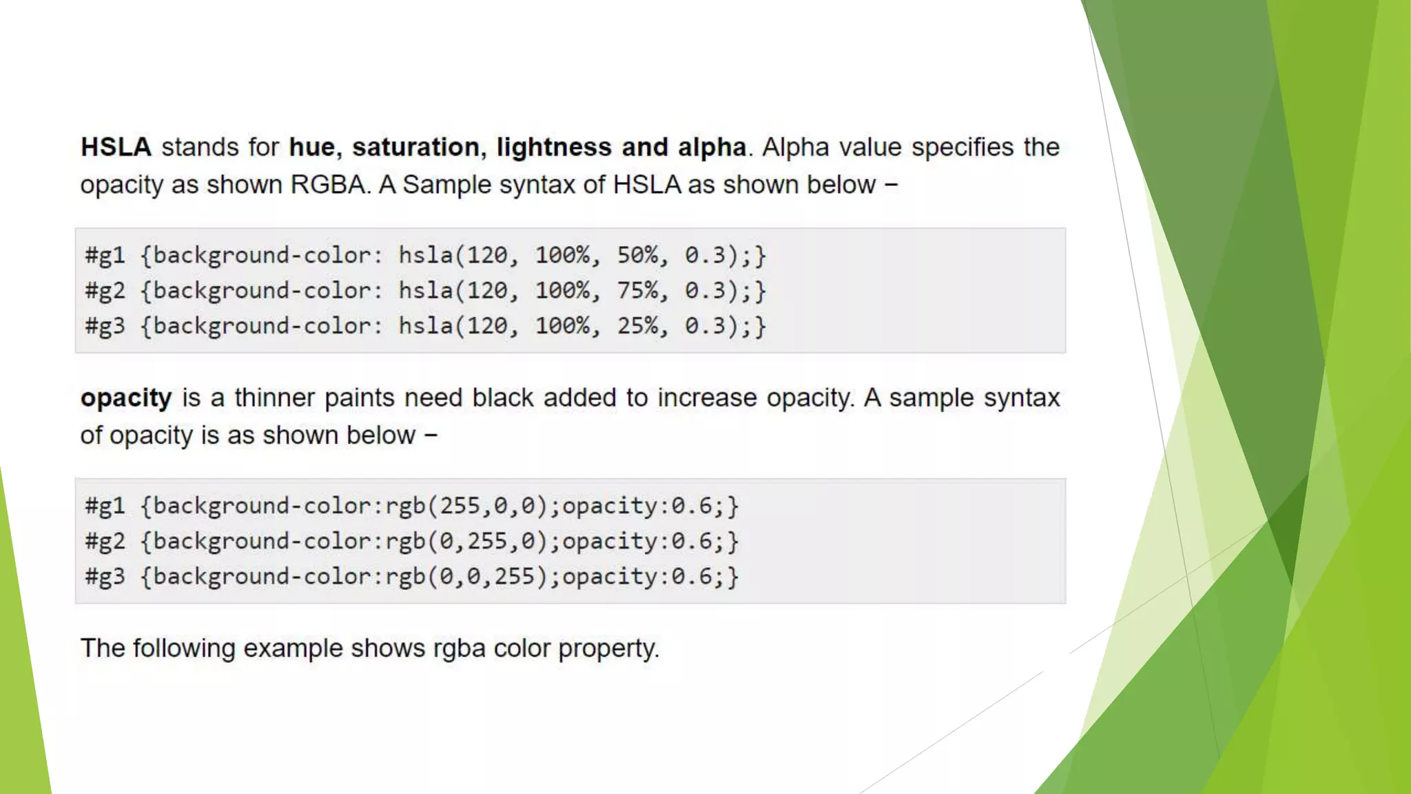 The document demonstrates different methods for specifying colors in CSS including RGBA, HSL, HSLA, and opacity. RGBA colors are assigned to paragraphs with red, green and blue backgrounds. HSL colors use hue, saturation and lightness values to create a green color at different intensities. HSLA extends HSL by adding opacity. Opacity is directly applied to RGB colors to create semi-transparent red, green and blue backgrounds.