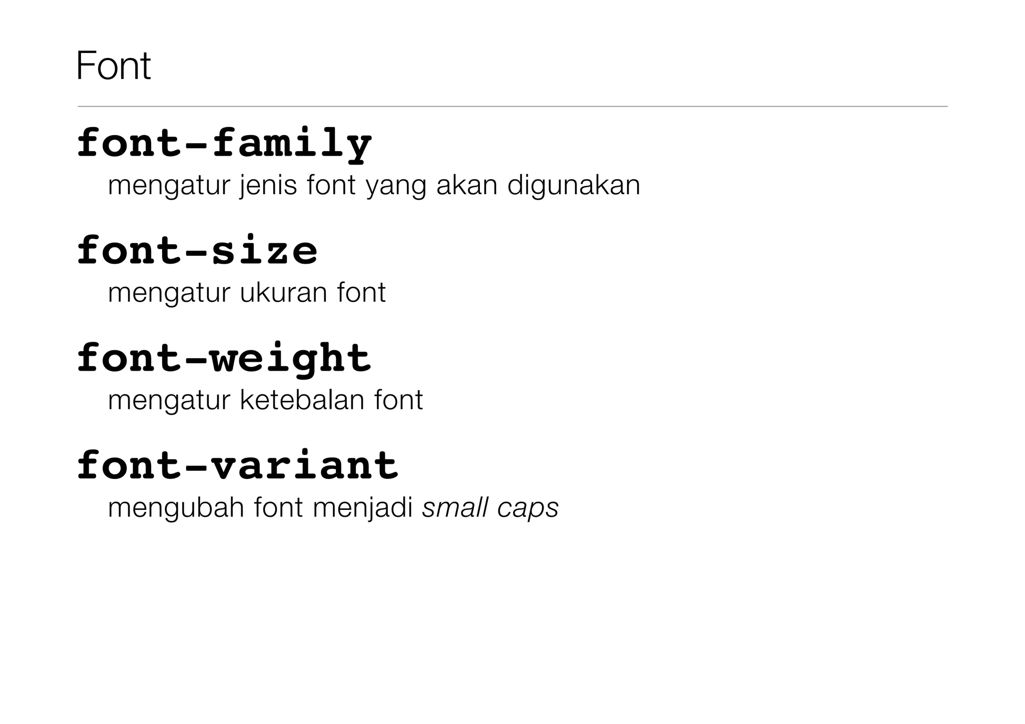 Font merupakan elemen pada halaman web yang berhubungan dengan typeface (jenis tulisan / huruf), bisa mengenai family-nya, ukuran, bold atau tidaknya dan lain-lain.