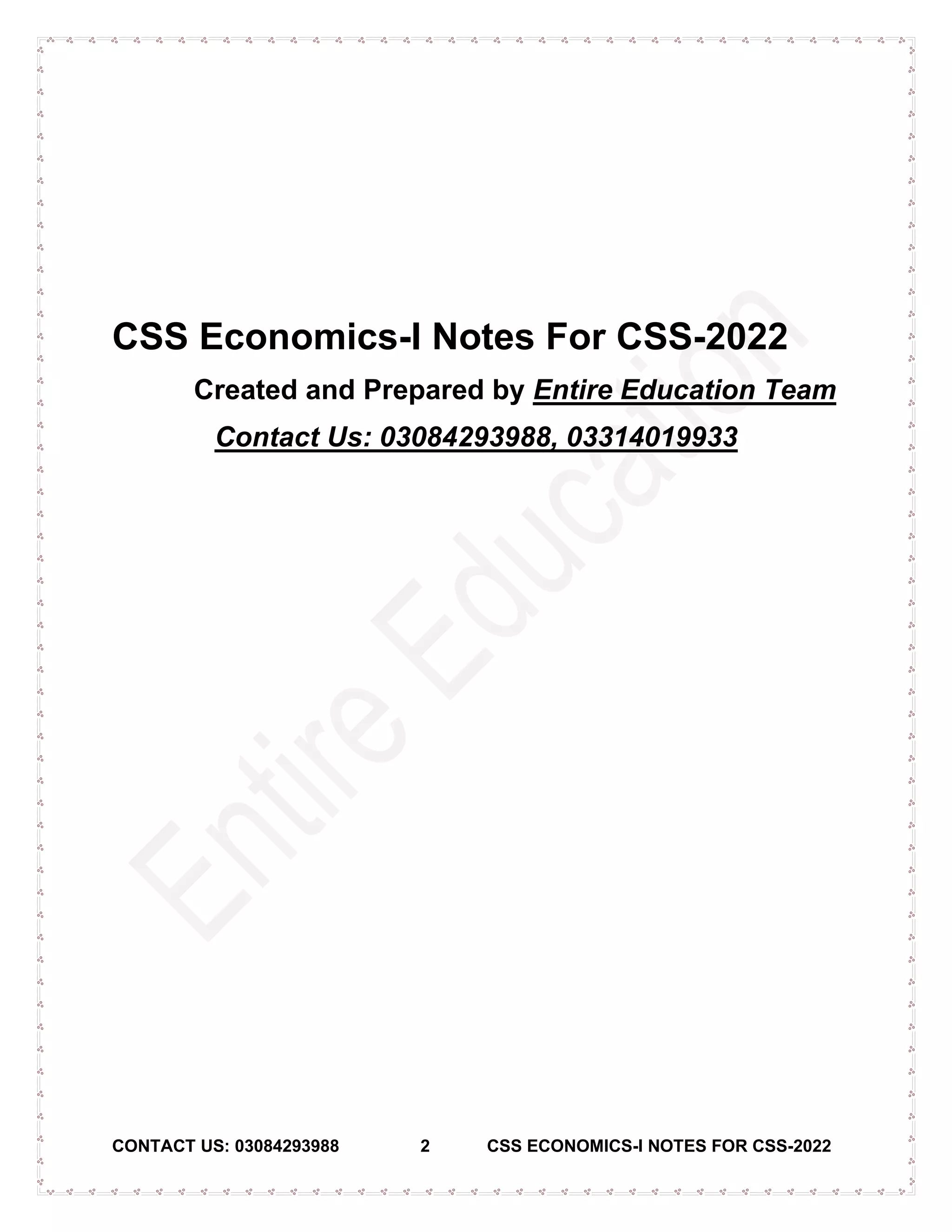 The document contains comprehensive notes on CSS Economics-I for the year 2022, covering topics including microeconomics, macroeconomics, money and banking, public financing, international trade, and economic development. It delves into key concepts such as consumer behavior, production theory, and the various economic models and theories that analyze decision making and resource allocation. The notes also discuss the historical development of economic theories, including both cardinal and ordinal theories of utility.