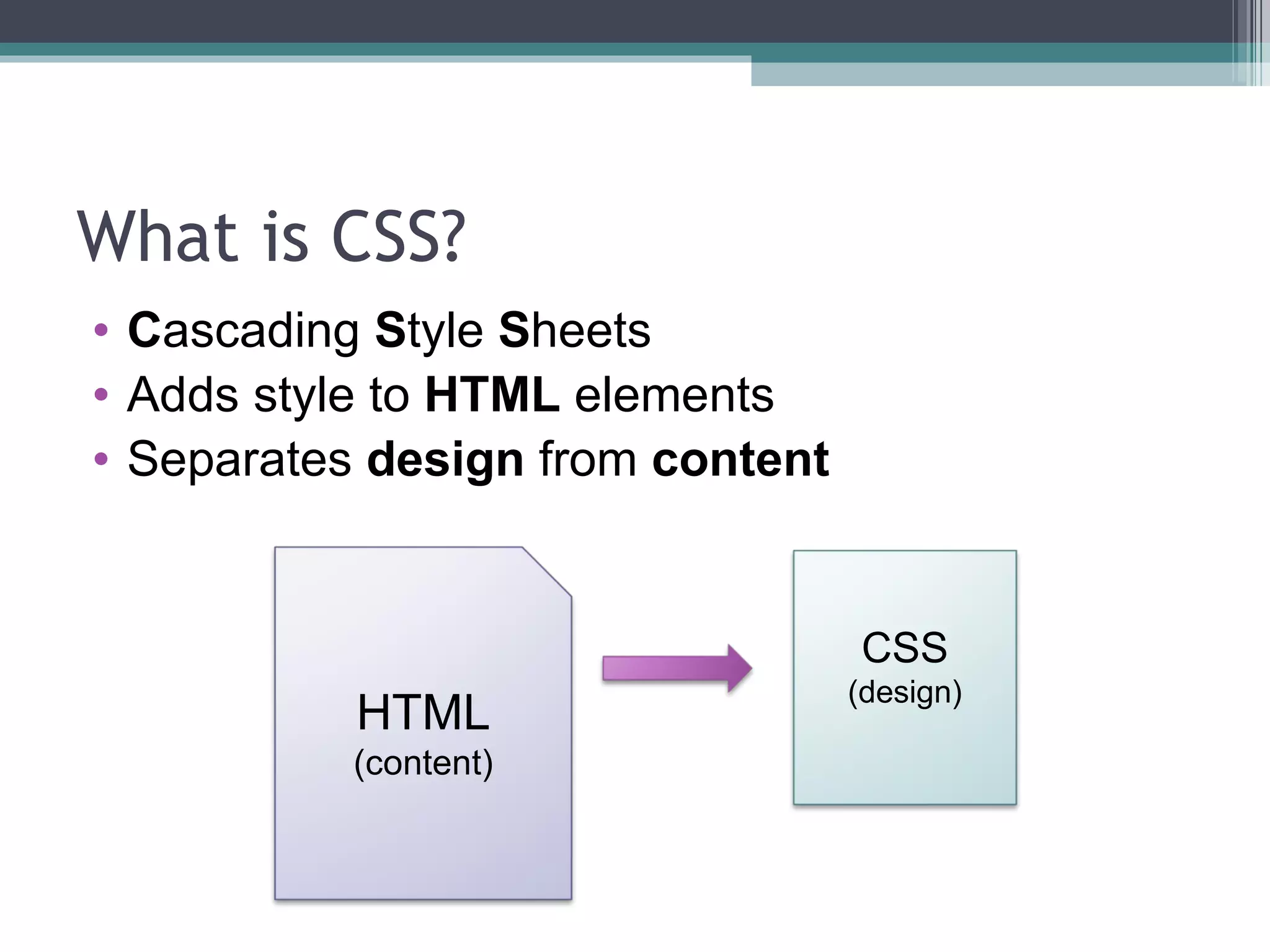 This document provides an introduction to CSS (Cascading Style Sheets) and how to use CSS to style HTML elements and lay out web pages. It covers basic HTML tags, linking an external CSS stylesheet, using selectors and properties to style elements, adding divs to structure content sections, and other CSS techniques like typography, images, and white space. Examples are given throughout and the reader is prompted to practice these skills by adding CSS to their own HTML code.